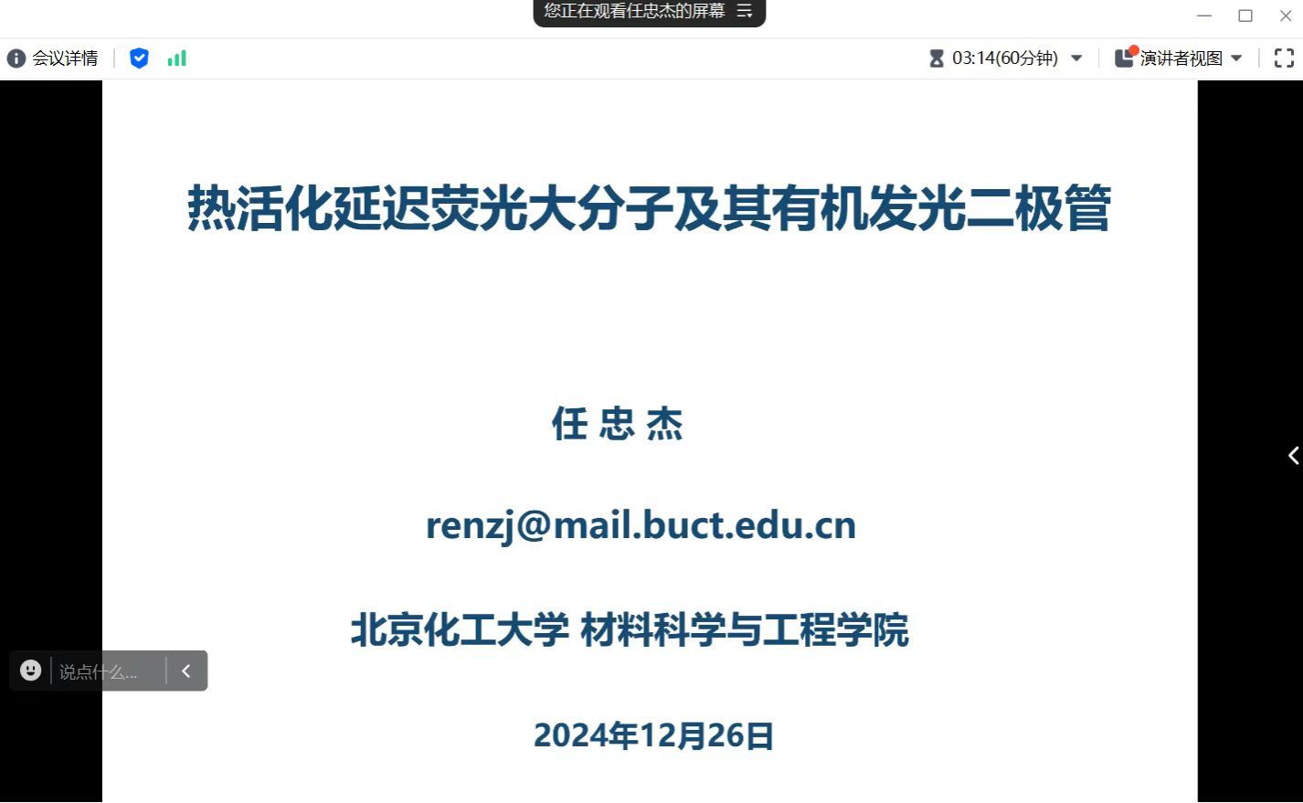 報(bào)告結(jié)束后,任忠杰教授與參會(huì)師生就TADF單元引入鹵化受體調(diào)控三重激發(fā)態(tài)的局域態(tài)占比等問題進(jìn)行了深入討論。此次前沿報(bào)告的舉行,加深了與會(huì)師生對(duì)不包含重金屬的熱活化延遲熒光(TADF)材料領(lǐng)域的研究和發(fā)展趨勢(shì)的認(rèn)識(shí),激發(fā)了研究生的創(chuàng)新熱情并拓寬了研究思路。