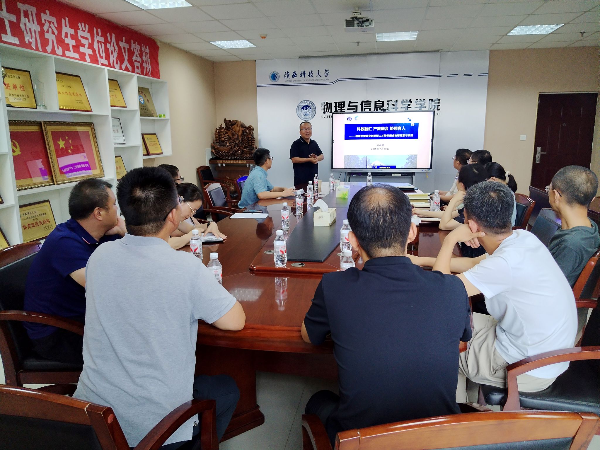楊戰(zhàn)營介紹了西北大學(xué)物理學(xué)院的歷史發(fā)展脈絡(luò)和物理學(xué)科涌現(xiàn)出的著名專家學(xué)者和知識分子楷模、學(xué)科平臺與專業(yè)核心課建設(shè)、校所合作“嚴(yán)濟(jì)慈英才班”人才培養(yǎng)模式等。會后,楊戰(zhàn)營與參會教師就如何有效開展課程體系建設(shè)、量子信息科學(xué)專業(yè)規(guī)劃、教改班建設(shè)、大學(xué)物理實(shí)驗(yàn)課程教學(xué)改革等展開了廣泛深入的交流。