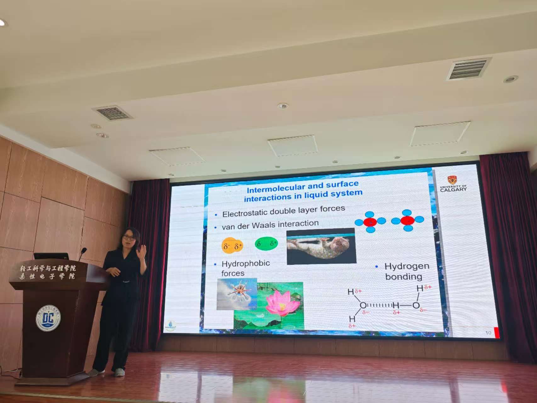 呂清葉教授首先介紹了在加拿大卡爾加里大學的科研環(huán)境與實驗室建設情況,分享了國際科研工作的經(jīng)驗與感悟。隨后,重點闡述了團隊在生物聚合物復合材料方面的最新研究成果。通過引入仿生設計理念與分子間相互作用調(diào)控,研究團隊構建了兼具功能性與可持續(xù)性的創(chuàng)新材料體系。在環(huán)境治理領域,基于生物混合物的多孔吸附材料展現(xiàn)出高效廢水處理、催化及抗菌等應用潛力。在材料設計方面,團隊提出“軟硬結合”策略:柔性聚合物鏈賦予材料優(yōu)異延展性,而剛性納米粒子提供結構支撐,從而使材料在反復彎折過程中仍能保持穩(wěn)定性能。