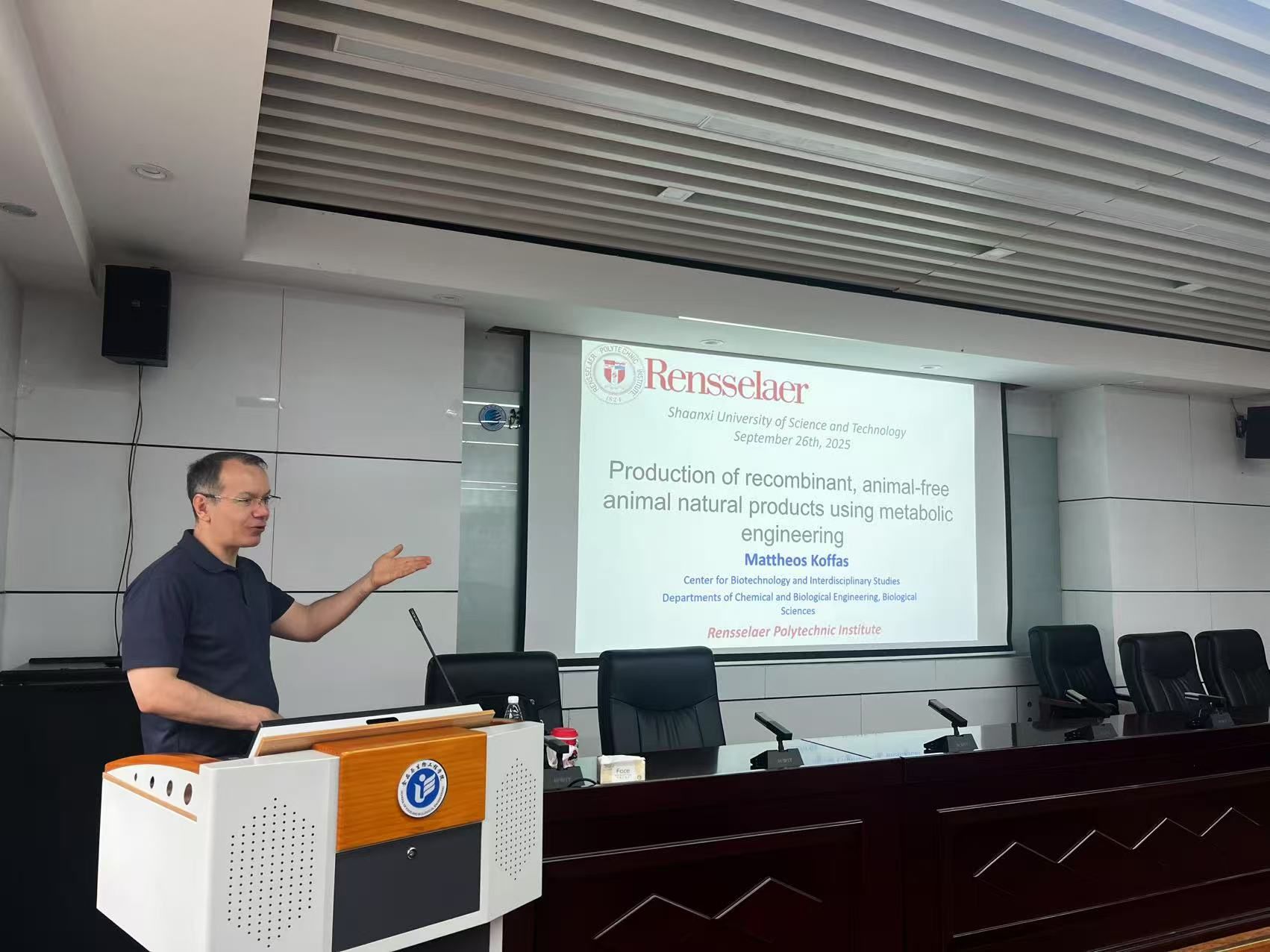 9月26日,應我校國際合作與交流處、食品科學與工程學院(生物與醫(yī)藥學院)邀請,美國倫斯勒理工學院Mattheos Koffas教授做客我?!皣H教育論壇”,來校交流訪問并做了題為“Production of recombinant, animal-free animal natural products using metabolic engineering”的學術(shù)報告。學院相關(guān)專業(yè)師生參加了本次報告會。