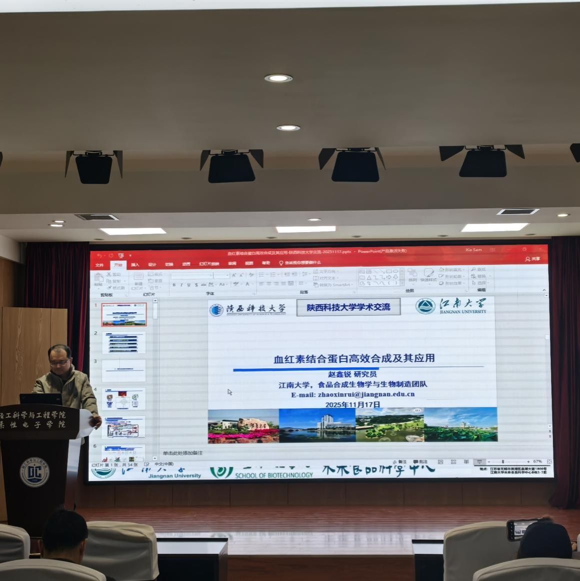 11月17日上午,受科技處、前沿院及輕工科學(xué)與工程學(xué)院(柔性電子學(xué)院)邀請,江南大學(xué)趙鑫銳研究員做客陜西科技大學(xué)“前沿科學(xué)報告”,作了題為“血紅素結(jié)合蛋白高效合成及其應(yīng)用”的學(xué)術(shù)報告。報告會由輕工學(xué)院院長呂斌主持,學(xué)院相關(guān)專業(yè)教師、研究生參加了此次報告會。