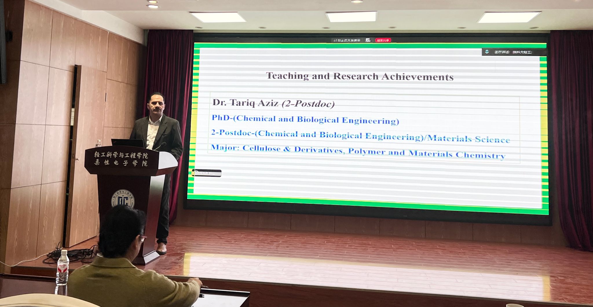 12月4日上午,應(yīng)輕工科學(xué)與工程(柔性電子學(xué)院)學(xué)院及國際合作與交流處邀請,Tariq Aziz博士做客我校國際教育論壇,作了題為“Synthesis Approaches and Surface Modifications of Cellulose Aerogels for Next-Generation Biomedical Applications”的學(xué)術(shù)報(bào)告。此次會(huì)議由張素風(fēng)教授主持,學(xué)院相關(guān)專業(yè)教師和學(xué)生參加了此次報(bào)告。