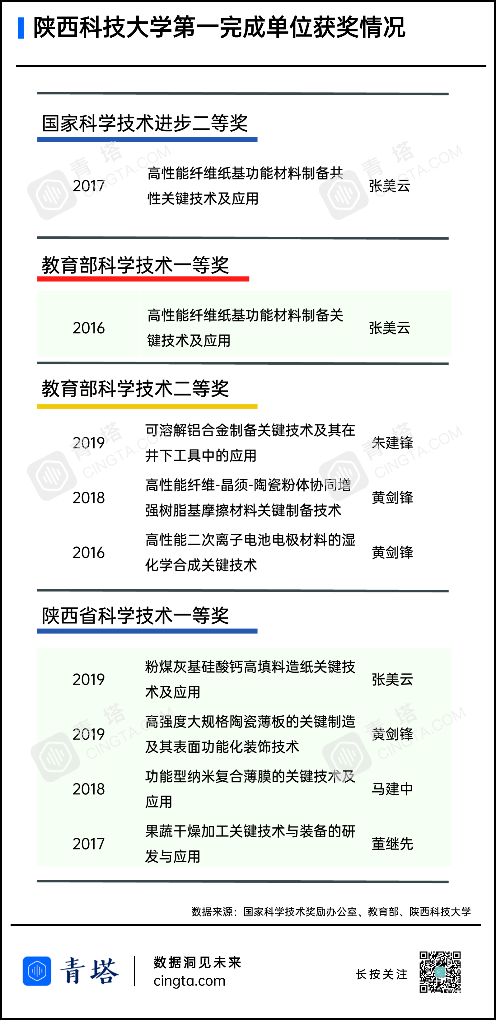 依托高水平的科研平臺,陜科大教師在科技獎項、高水平論文和授權發(fā)明專利等各方面都取得了累累碩果。2017年度國家科學技術獎勵大會上,由陜西科技大學張美云教授主持的創(chuàng)新性研究成果“高性能纖維紙基功能材料制備共性關鍵技術與應用”榮獲國家科學技術進步二等獎。以地方高校的身份斬獲國家獎,陜西科技大學的科研實力已然位居全國省屬高校前列。在2019年度陜西省高等學??茖W技術獎勵成果的評選中,陜西科技大學的參評獲獎率更是高達100%,同時斬獲一等獎6項,二等獎3項,三等獎2項,一等獎獲獎數(shù)量位居陜西省省屬高校第一位(并列)。