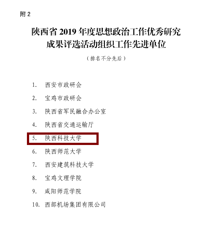近日,在陜西省委宣傳部、陜西省思想政治工作研究會組織開展的2019年度陜西省思想政治工作優(yōu)秀研究成果評選活動中,我校獲組織工作先進(jìn)單位,全省僅10家獲此殊榮。