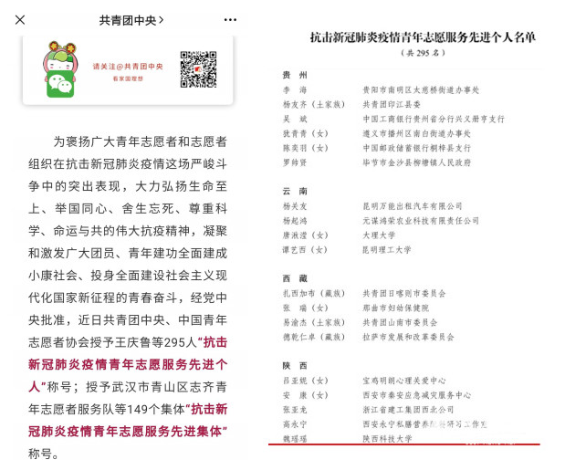 憑借出色的工作表現(xiàn)和舍我其誰(shuí)的責(zé)任擔(dān)當(dāng),魏瑤瑤在2020年榮獲陜西省青年志愿者協(xié)會(huì)疫情防控“高級(jí)志愿者”、紅色青春志愿服務(wù)中心抗擊疫情“優(yōu)秀工作者”等多項(xiàng)榮譽(yù)稱(chēng)號(hào)。