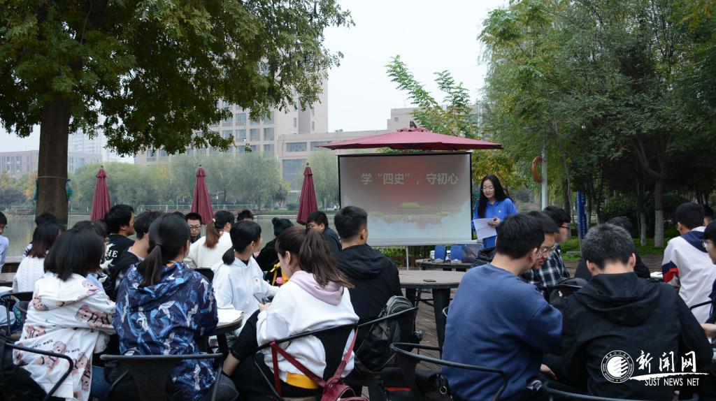 “我們?yōu)槭裁匆獙W(xué)‘四史’?”微風(fēng)徐徐,湖水蕩漾,黑天鵝們悠然的在水中嘻戲,30多個青年學(xué)子圍坐在科大湖西岸1958學(xué)術(shù)廣場,一堂圍繞“四史”教育開展的“黨味”濃厚、“鮮味”十足、“情懷”至真的主題團(tuán)日活動,成為他們在濃濃的秋意里專享的一份“精神大餐”。這是陜科大傾情打造的“第二思政課堂”—湖畔講堂與主題團(tuán)日的一次融合,依托美麗的科大湖景和天然的自然風(fēng)光,將嚴(yán)肅的思政課由室內(nèi)搬到了湖畔邊、樹蔭下。