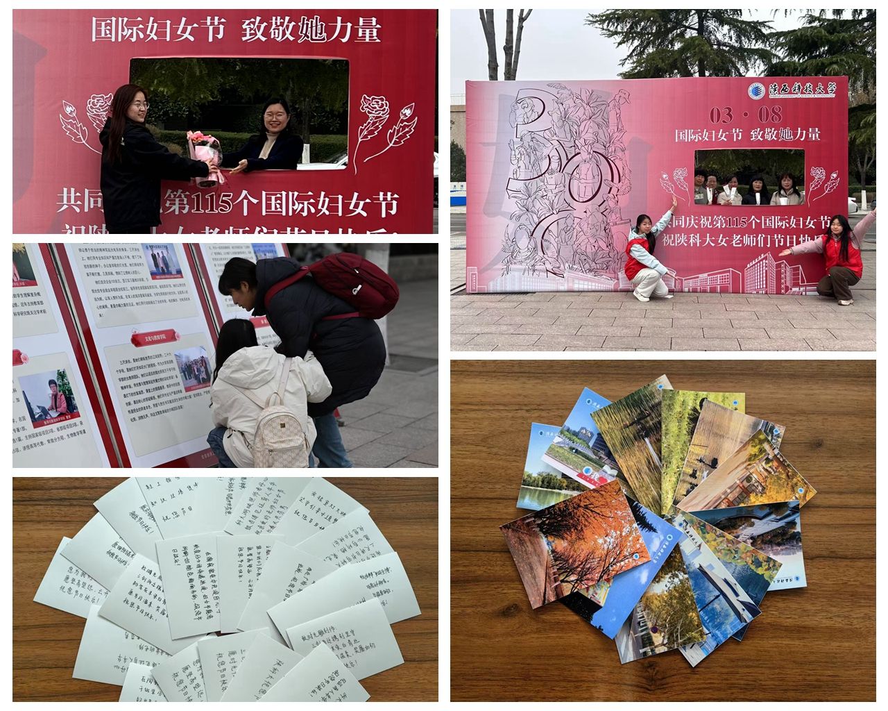與巾幗風(fēng)采展展出同時(shí),校團(tuán)委組織學(xué)生會(huì)、青年志愿者服務(wù)團(tuán)、青新工作室等學(xué)生組織開展了“致敬‘她’力量”和“紙短情長(zhǎng)·芳華禮贊”主題活動(dòng)?;顒?dòng)現(xiàn)場(chǎng),馥郁芬芳的康乃馨、科大元素的手寫賀卡、精心設(shè)計(jì)的打卡墻吸引了眾多目光?;顒?dòng)期間,女老師們熱情參與,打卡人數(shù)超200人。一張張燦爛的笑臉、一幅幅溫馨的合照都傳遞著對(duì)女性的崇高敬意與美好祝福。