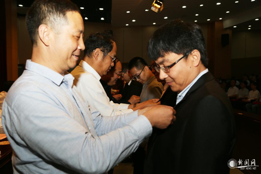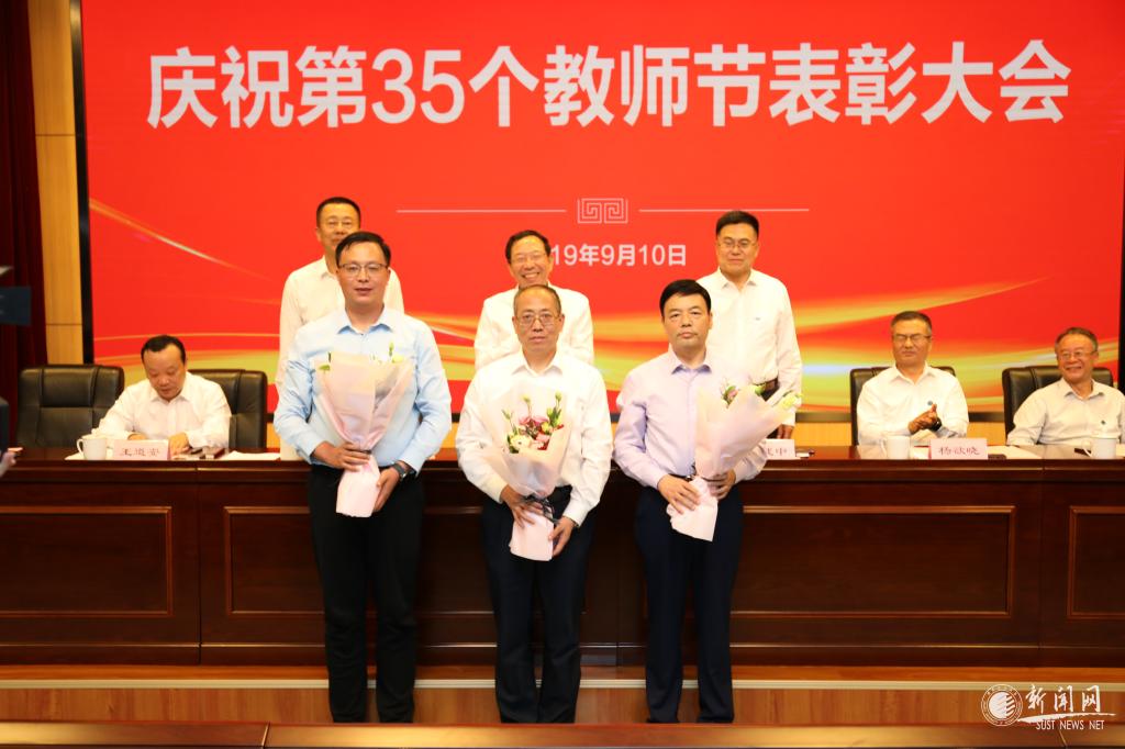 在熱烈的氣氛中,與會校領導向2018年度優(yōu)秀教師及先進工作者頒發(fā)榮譽證書,向從教滿三十年榮譽教師頒發(fā)紀念獎杯,向在2018-2019學年度獲得突出業(yè)績的優(yōu)秀教職工代表送上表達祝福和感謝的鮮花。令人感動的是,從教滿三十年榮譽教師還為新進教師代表佩戴校徽,傳遞了一份立德樹人的責任與期待,這也是我校本屆教師節(jié)表彰活動的一個新增環(huán)節(jié)。