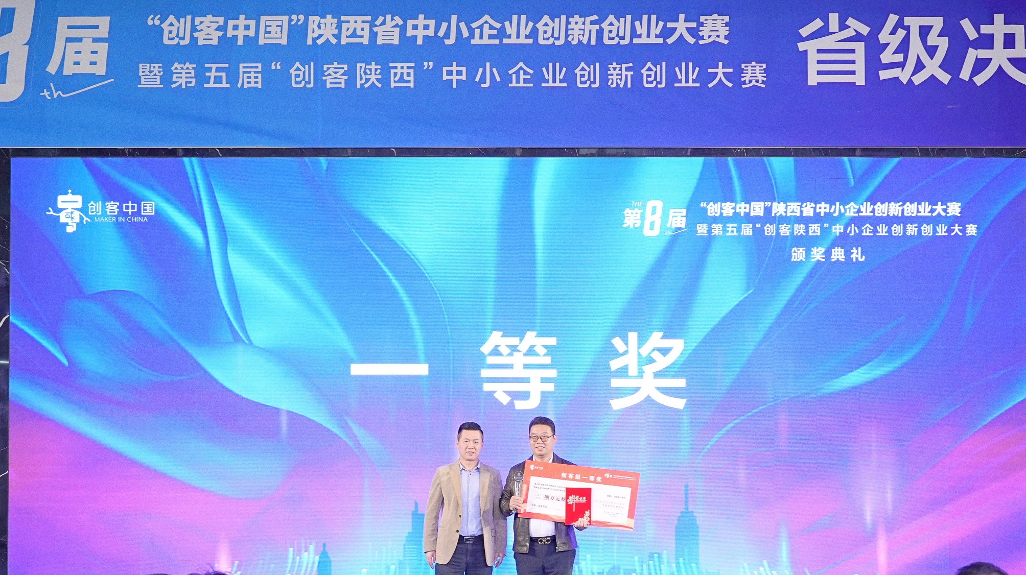 陜西省工業(yè)和信息化廳二級(jí)巡視員沈樹(shù)濤為梁承遠(yuǎn)教授(右一)頒獎(jiǎng)