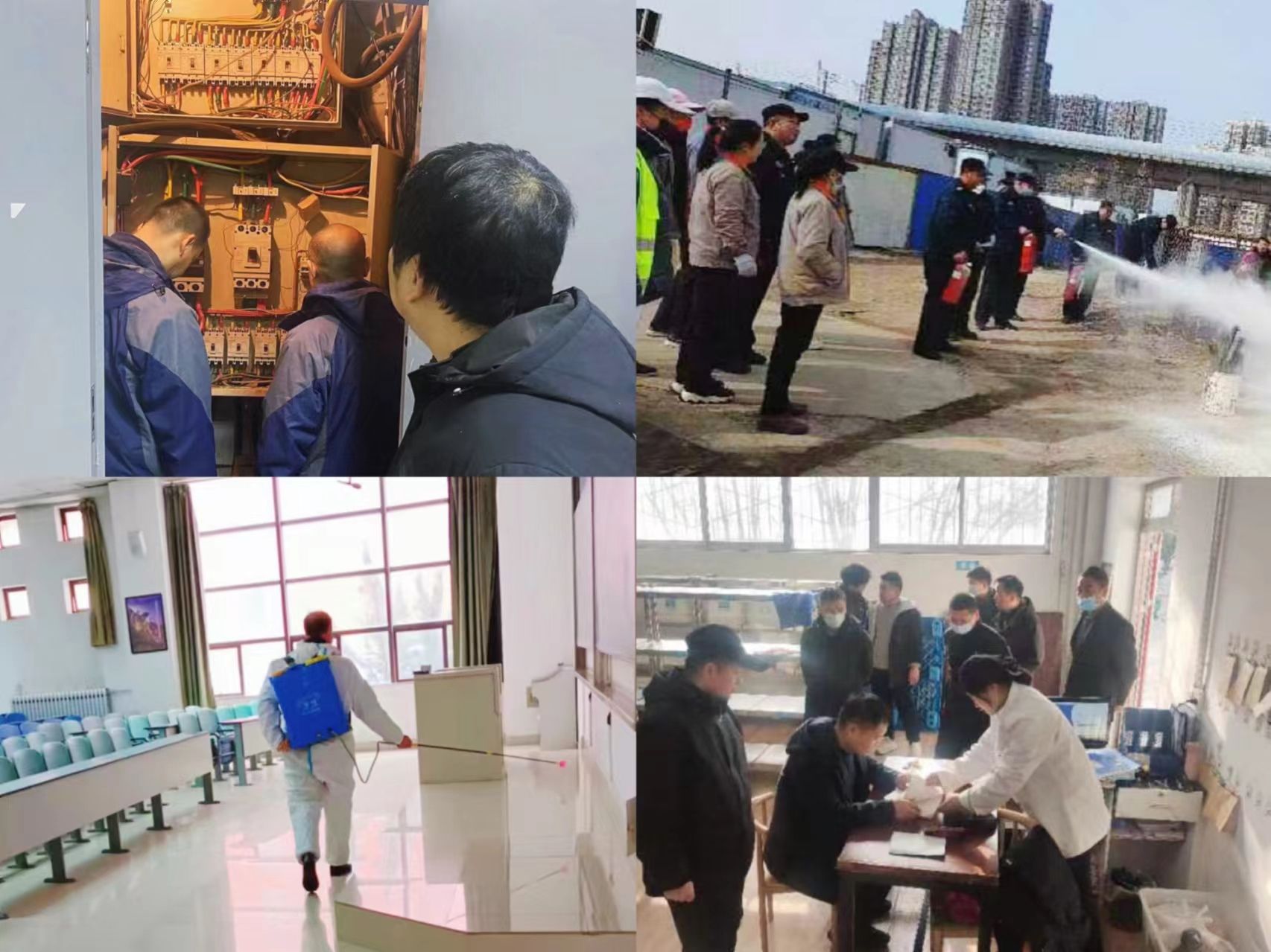 在主管校領(lǐng)導(dǎo)的指導(dǎo)下,集團(tuán)班子親臨一線,積極落實(shí)工作部署,開展自查自糾,堅(jiān)持值班值守和巡查巡邏,及時(shí)上報(bào)和處理突發(fā)情況,確保安全穩(wěn)定工作落到實(shí)處。定期對(duì)全校水電暖運(yùn)行情況、線路安全、配電裝置運(yùn)轉(zhuǎn)狀況進(jìn)行安全檢查,及時(shí)消除安全隱患,確保設(shè)備正常運(yùn)轉(zhuǎn);在家屬區(qū)采用多種方式宣傳假期安全知識(shí)和消防常識(shí),加強(qiáng)巡查和整改力度,集中清理樓內(nèi)雜物,組織物業(yè)全體員工進(jìn)行應(yīng)急事件處理、電梯安全、消防安全學(xué)習(xí)和演練;積極做好假期疫苗接種和開學(xué)傳染病防控準(zhǔn)備工作,針對(duì)冬春季呼吸道傳染病和出血熱預(yù)防進(jìn)行全校范圍消毒;積極落實(shí)省教育廳文件要求,從1月底開始開展為期6個(gè)月的校園食品安全排查整治專項(xiàng)行動(dòng),采取有力有效措施,切實(shí)保障在校師生飲食安全。