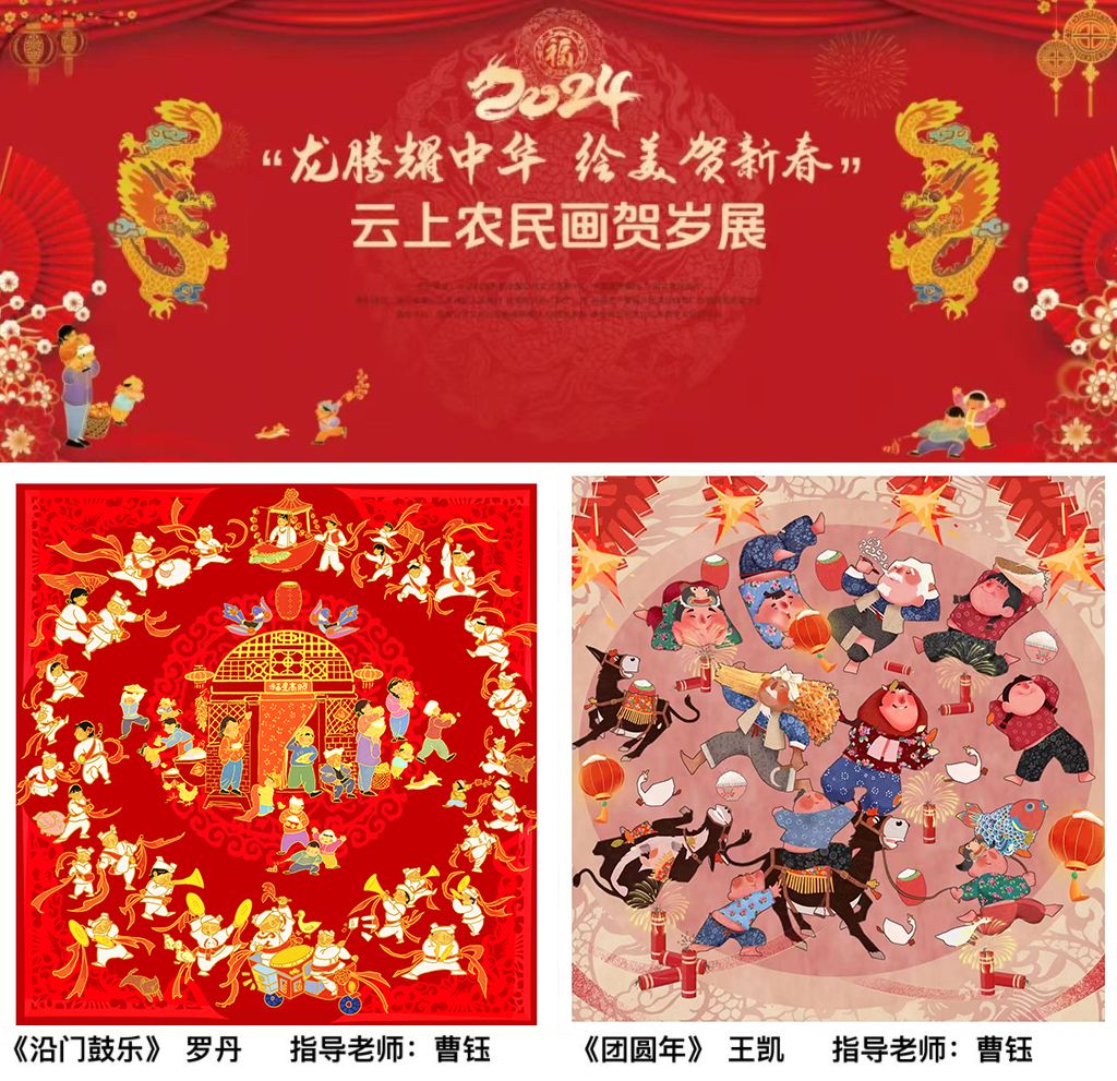 “2024年新春農(nóng)民畫賀歲展”精選了來自全國各地民間藝術家、文化館干部、美術院校師生以及業(yè)余農(nóng)民畫愛好者創(chuàng)作的200余幅優(yōu)秀畫作,我校學子作品脫穎而出,用當代新青年視角展示出陜西本土民風民俗。值得一提的是,本次全國大展的宣傳物料在設計之初就特別選取了《沿門鼓樂》中的部分角色造型,羅丹同學靈動的畫風為本次年畫大展的宣傳海報設計增色不少,展示了我校設藝學院多年來在非遺創(chuàng)新、文旅結合等方面不斷積累的創(chuàng)作成果與傲人成績。