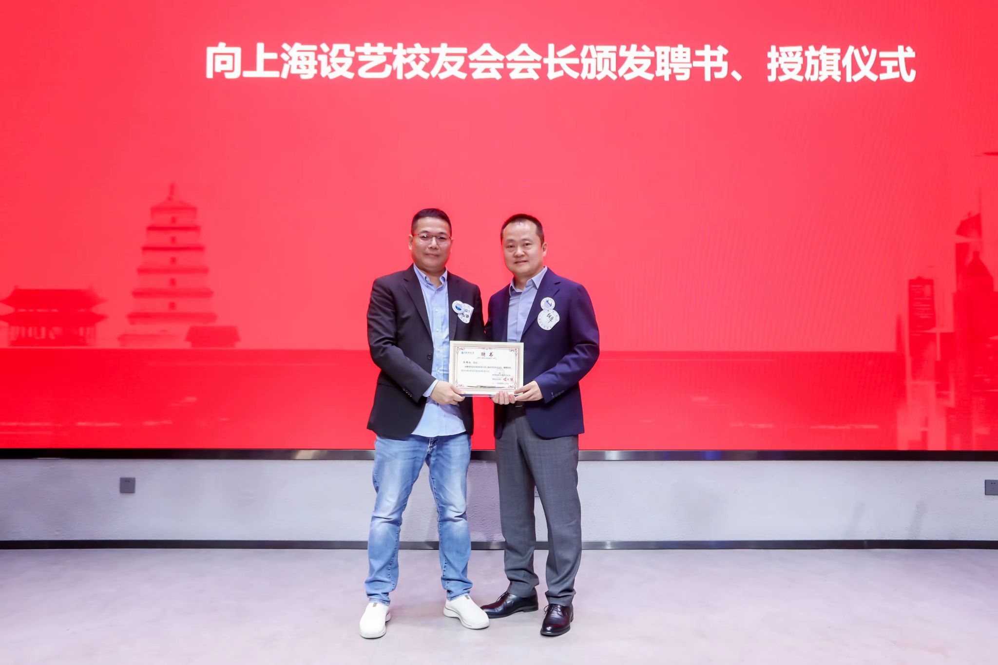 李學(xué)軍為上海設(shè)藝校友會(huì)會(huì)長(zhǎng)陳錦枝頒發(fā)聘書。陳錦枝為上海設(shè)藝校友會(huì)常務(wù)副會(huì)長(zhǎng)、副會(huì)長(zhǎng)、秘書長(zhǎng)、副秘書長(zhǎng)頒發(fā)聘書。