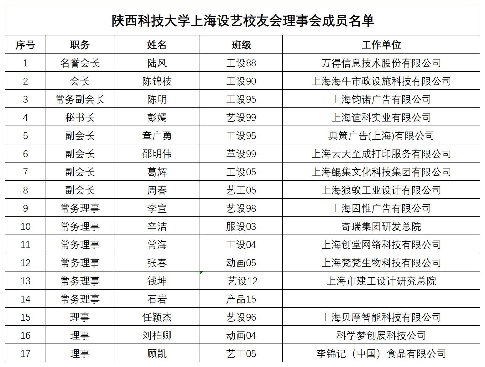 附:陜西科技大學(xué)上海設(shè)藝校友會(huì)理事會(huì)成員名單