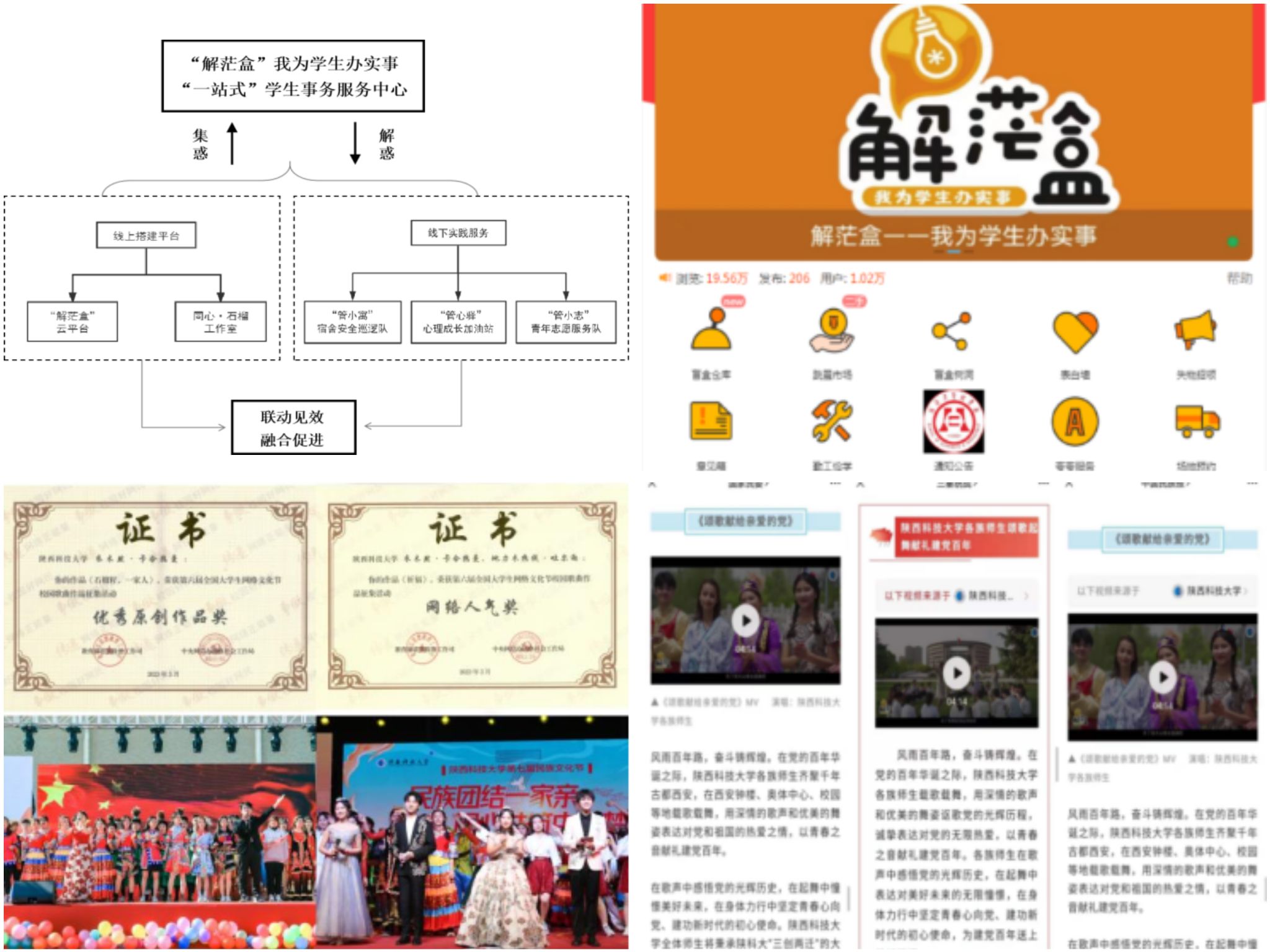 自中心建立以來,建設成果豐富,發(fā)揮較好的示范效應。一是成功獲批陜西省大學生創(chuàng)新創(chuàng)業(yè)訓練省級項目;二是入選陜西好網民工程重點項目;三是工作案例《解茫盒-云端領航青春校園網絡文化案例》獲得陜西高校網絡思想政治工作案例二等獎。四是全國高校思想政治工作網以題為《陜西科技大學:構建“解茫盒”云平臺,打造線上線下聯(lián)動融合新格局》報道此項工作。