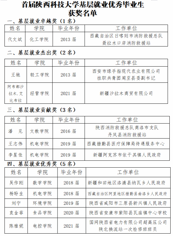 為積極響應國家鼓勵高校畢業(yè)生到西部、到基層就業(yè)創(chuàng)業(yè)戰(zhàn)略,進一步優(yōu)化學校人才培養(yǎng)結構,教育和引導畢業(yè)生樹立扎根基層、服務西部的就業(yè)觀和擇業(yè)觀,我校于本學期啟動“陜西科技大學首屆基層就業(yè)優(yōu)秀畢業(yè)生評選活動”。4月26日,該項活動評選及公示環(huán)節(jié)正式結束,共評選出以化學與化工學院2013屆畢業(yè)生代文斌、輕工科學與工程學院(柔性電子學院)2013屆畢業(yè)生王馳、經(jīng)濟與管理學院(亞歐貿易與數(shù)字經(jīng)濟學院)2021屆畢業(yè)生阿布都沙拉木.艾比布拉等為代表的11名基層就業(yè)優(yōu)秀畢業(yè)生。
