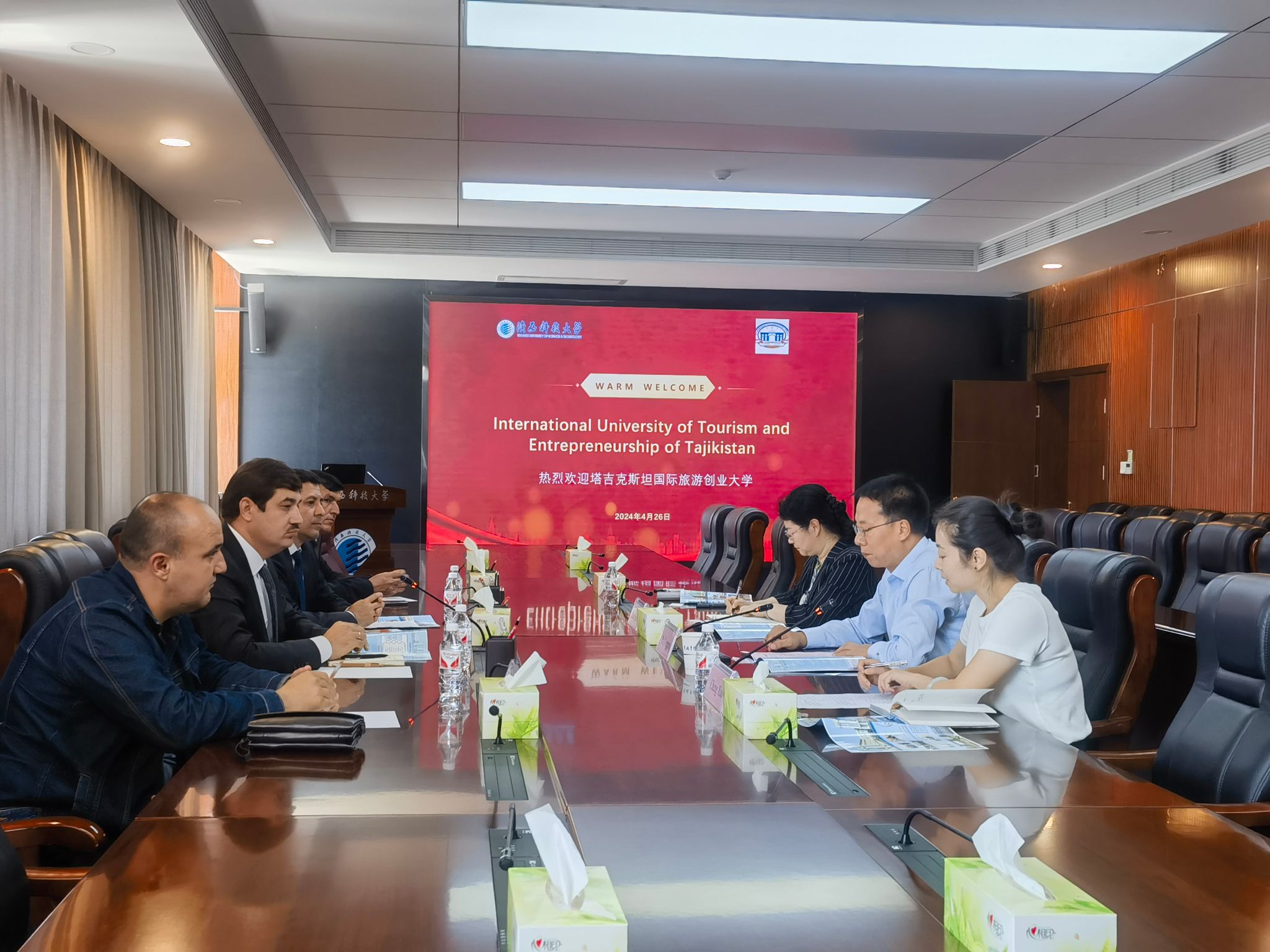 4月26日下午,塔吉克斯坦國(guó)際旅游創(chuàng)業(yè)大學(xué)校長(zhǎng)Asrorzoda Ubaidullo Sattor(阿斯羅佐達(dá)·烏拜杜洛·賽特)一行4人來(lái)我校訪問(wèn)交流,副校長(zhǎng)蒲永平出席座談會(huì),國(guó)際處相關(guān)負(fù)責(zé)人參加座談。