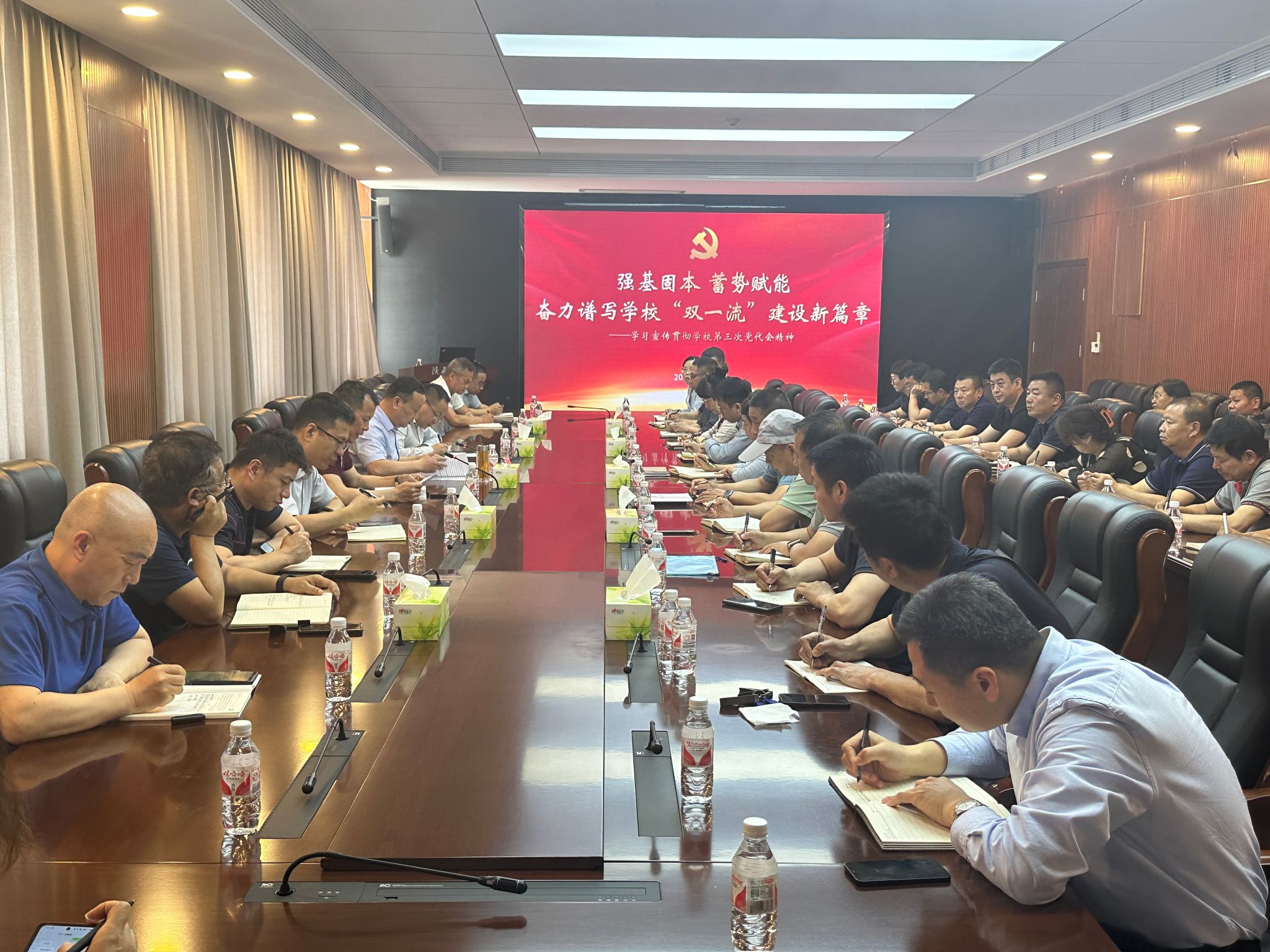 王道安指出,學(xué)校第三次黨代會(huì)是在加快推進(jìn)教育現(xiàn)代化、建設(shè)教育強(qiáng)國(guó)的關(guān)鍵時(shí)期,學(xué)?!叭阶摺卑l(fā)展戰(zhàn)略“奠基期”圓滿完成、“復(fù)興期”開局起步的重要節(jié)點(diǎn),召開的一次十分重要的會(huì)議。要堅(jiān)持“一張藍(lán)圖繪到底、一茬接著一茬干”的大會(huì)主基調(diào),深刻領(lǐng)會(huì)、準(zhǔn)確把握第三次黨代會(huì)的主題,學(xué)校第二次黨代會(huì)以來(lái)取得的發(fā)展成就和寶貴經(jīng)驗(yàn),學(xué)校現(xiàn)階段面臨的形勢(shì)和“復(fù)興期”奮斗目標(biāo),學(xué)校今后五年的重點(diǎn)任務(wù),對(duì)持續(xù)加強(qiáng)黨的全面領(lǐng)導(dǎo)、以高質(zhì)量黨建引領(lǐng)事業(yè)高質(zhì)量發(fā)展提出的明確要求等五方面內(nèi)容,切實(shí)把思想和行動(dòng)統(tǒng)一到校黨委決策部署上來(lái)。他強(qiáng)調(diào),要按照“對(duì)標(biāo)對(duì)表理思路,凝神聚力謀發(fā)展,解放思想創(chuàng)新干,堅(jiān)定信心抓落實(shí)”的要求,從思想上政治上行動(dòng)上全面貫徹落實(shí)學(xué)校第三次黨代會(huì)精神,解放思想,銳意進(jìn)取,鉚足干勁,奮勇爭(zhēng)先,不斷推動(dòng)學(xué)校高質(zhì)量發(fā)展邁出新步伐。