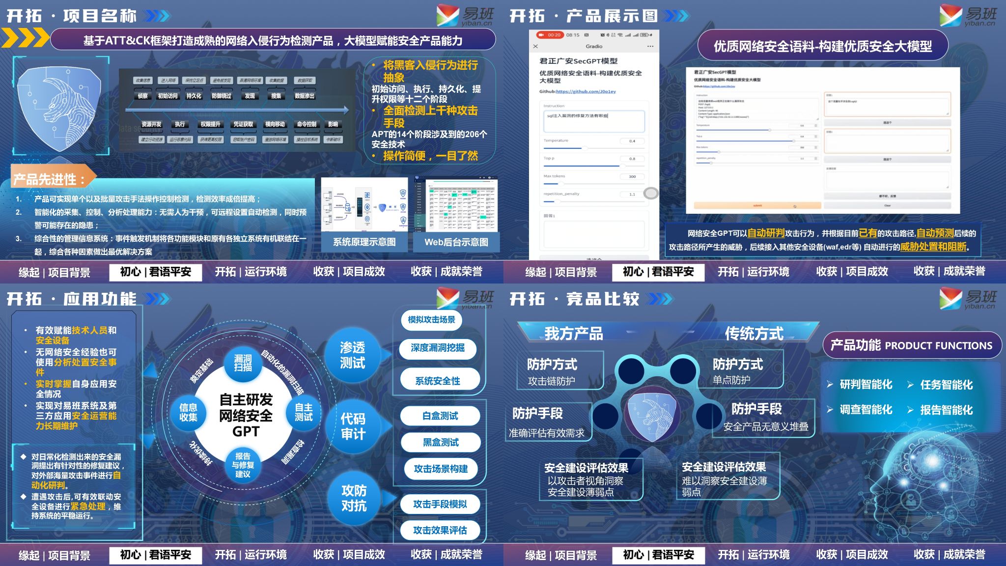 “自主研發(fā)獎”獲獎作品《君語平安—基于大語言模型的易班網(wǎng)絡(luò)安全智能防御系統(tǒng)》,通過將基于大語言模型自主研發(fā)的“獬豸”網(wǎng)絡(luò)入侵行為智能檢測平臺,與網(wǎng)絡(luò)安全GPT深度結(jié)合,為易班平臺提供實(shí)時的安全檢測,為廣大易班用戶的安全保駕護(hù)航。