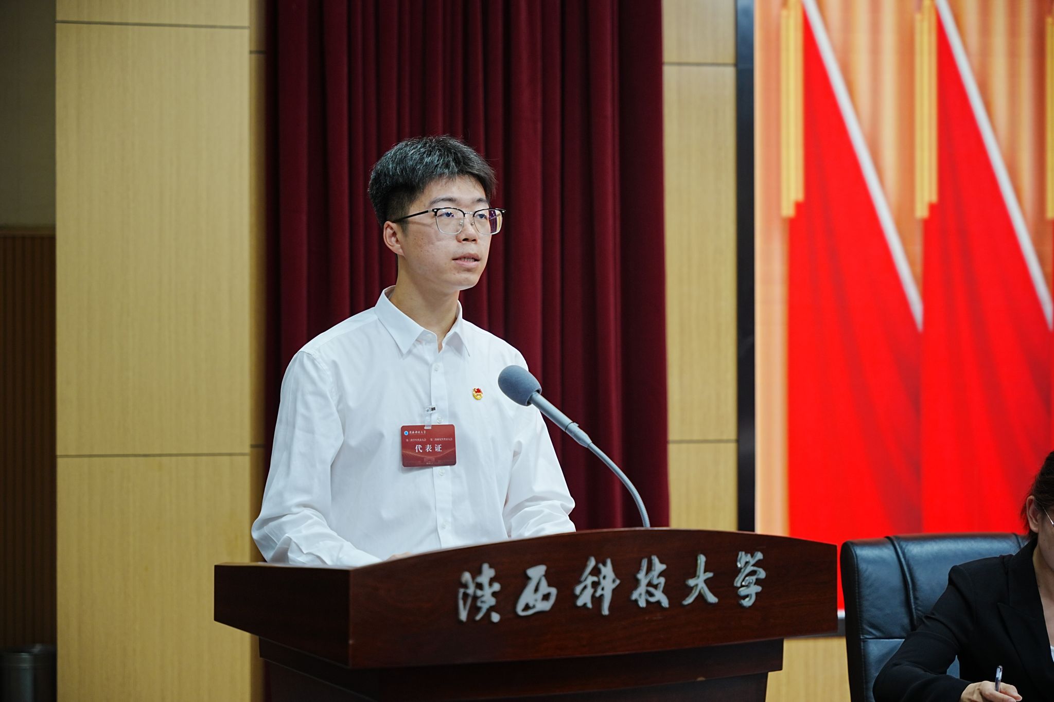 白怡暄代表省學(xué)聯(lián)對(duì)我校學(xué)生會(huì)、研究生會(huì)過去取得的成績(jī)給予高度評(píng)價(jià),并向青年代表們分享三點(diǎn)心得:一是要做到強(qiáng)化政治認(rèn)同,保持踔厲奮發(fā)姿態(tài);二是要做到堅(jiān)持服務(wù)同學(xué),始終牢記改革方向;三是要做到聚焦陜西定位,積極投身報(bào)國(guó)實(shí)踐。與省學(xué)聯(lián)和全省各級(jí)學(xué)聯(lián)、學(xué)生會(huì)組織一道攜手共進(jìn),團(tuán)結(jié)引領(lǐng)廣大同學(xué)努力成長(zhǎng)為中國(guó)特色社會(huì)主義事業(yè)的合格建設(shè)者和可靠接班人。西安交通大學(xué)學(xué)生會(huì)主席團(tuán)成員郝婧婧代表兄弟院校學(xué)生會(huì)組織向大會(huì)的順利召開表示祝賀。