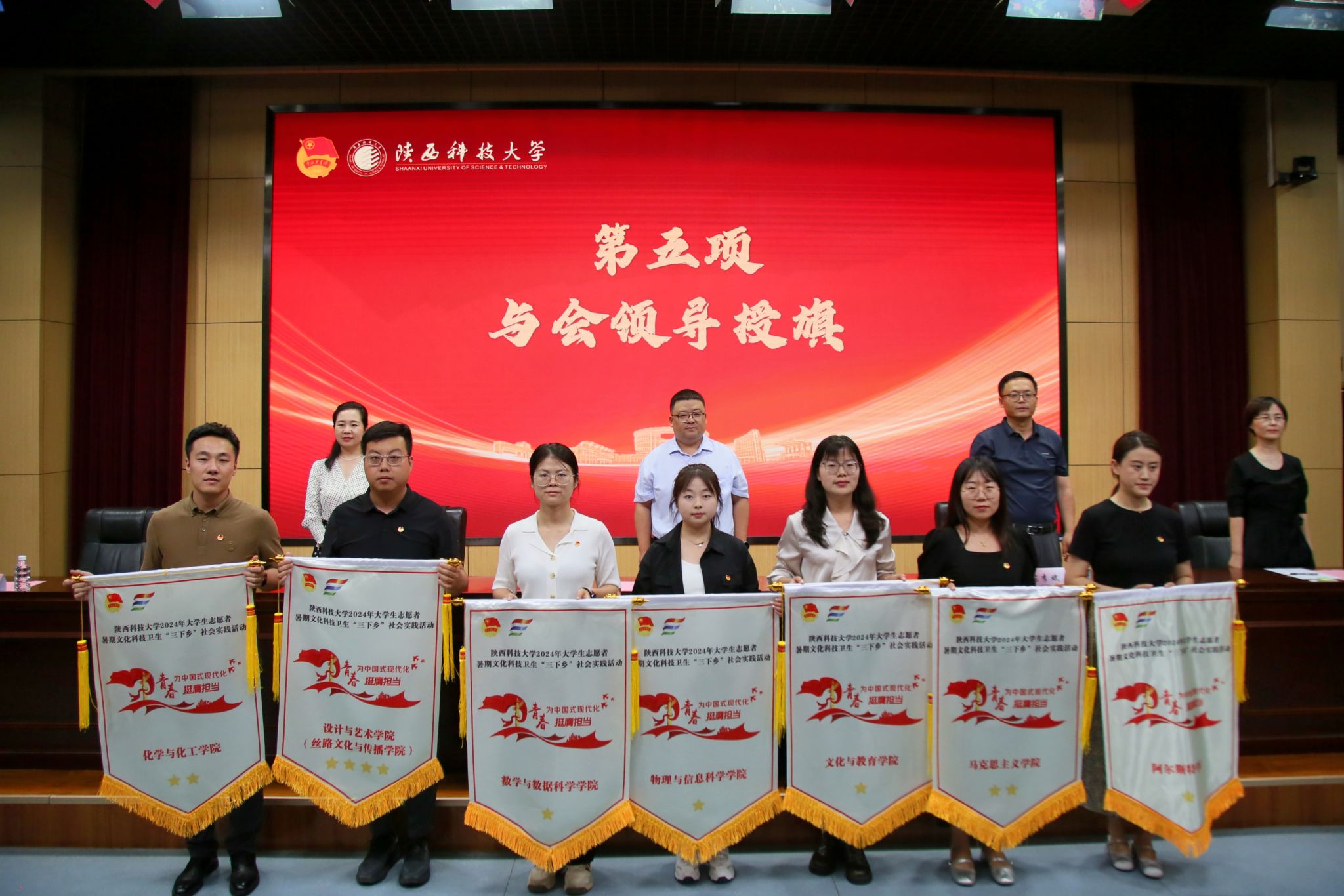 學(xué)工部副部長(zhǎng)田少寧宣讀了《關(guān)于確定2024年陜西科技大學(xué)大學(xué)生志愿者暑期文化科技衛(wèi)生“三下鄉(xiāng)”社會(huì)實(shí)踐活動(dòng)校級(jí)立項(xiàng)團(tuán)隊(duì)名單的決定》。經(jīng)濟(jì)與管理學(xué)院陳強(qiáng)代表指導(dǎo)教師發(fā)言,材料與科學(xué)工程學(xué)院李詩(shī)怡代表社會(huì)實(shí)踐學(xué)生發(fā)言。隨后,與會(huì)領(lǐng)導(dǎo)為我?!叭锣l(xiāng)”社會(huì)實(shí)踐代表團(tuán)隊(duì)授旗。