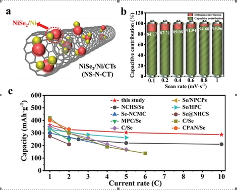 (a)NiSe2/Ni/CT的結(jié)構(gòu)示意圖;(b) 不同掃描速率下Se@NiSe2/Ni/CTs電極電容容量的歸一化貢獻(xiàn)率;(c) Se@NiSe2/Ni/CTs與其他報(bào)道的Na-Se電池材料的比較。