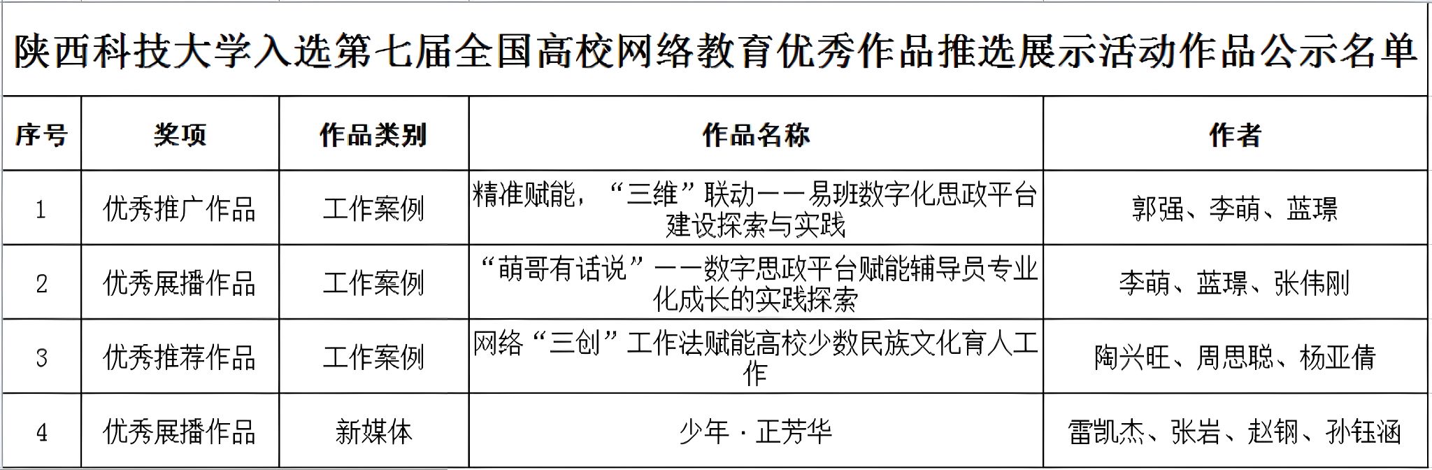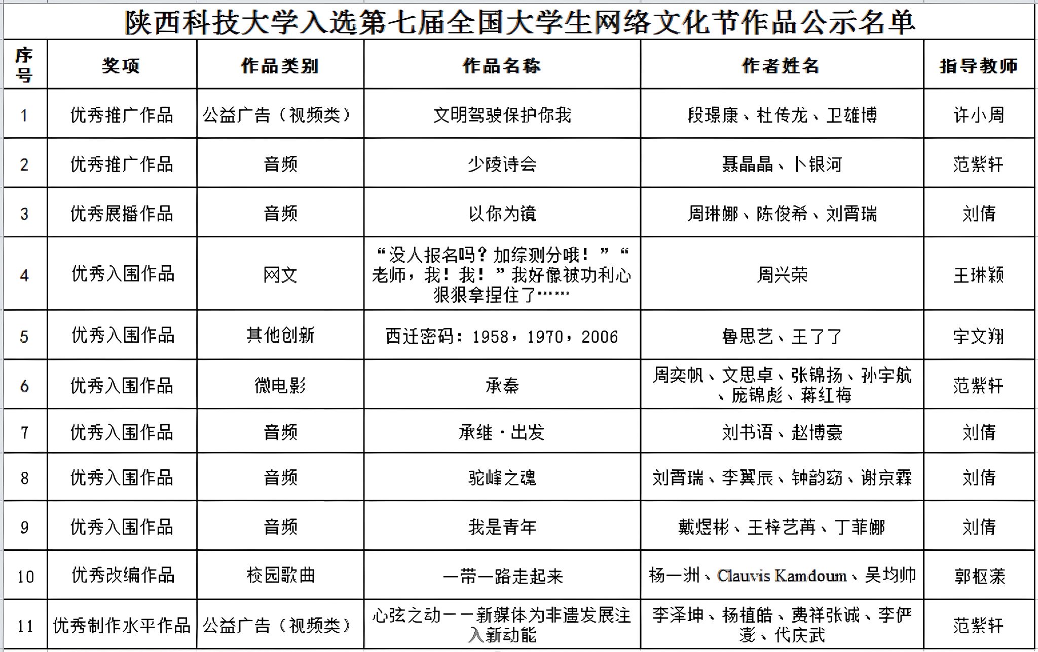 第七屆“全國大學(xué)生網(wǎng)絡(luò)文化節(jié)”和“全國高校網(wǎng)絡(luò)教育優(yōu)秀作品推選展示活動”以“爭做校園好網(wǎng)民,匯聚網(wǎng)絡(luò)正能量,挺膺擔(dān)當(dāng)建新功”為主題,設(shè)置優(yōu)秀推廣作品獎、優(yōu)秀展播作品獎、優(yōu)秀推薦作品獎、優(yōu)秀入圍作品獎等獎項及獲獎等次,旨在活躍校園網(wǎng)絡(luò)空間生態(tài),全面提升網(wǎng)絡(luò)素養(yǎng),推進網(wǎng)絡(luò)文明建設(shè),活動共征集到來自全國范圍內(nèi)5萬余件作品。自2023年9月活動啟動以來,學(xué)校高度重視,廣泛動員,積極營造良好宣傳氛圍,推動廣大師生積極參與網(wǎng)絡(luò)文化作品創(chuàng)作生產(chǎn),共征集到作品300余件。經(jīng)作品申報、校級評選、擇優(yōu)推薦等環(huán)節(jié),我校向第七屆陜西高校大學(xué)生網(wǎng)絡(luò)文化節(jié)和網(wǎng)絡(luò)教育優(yōu)秀作品推選展示活動推薦優(yōu)秀作品56件,其中44件成果進入全國遴選。