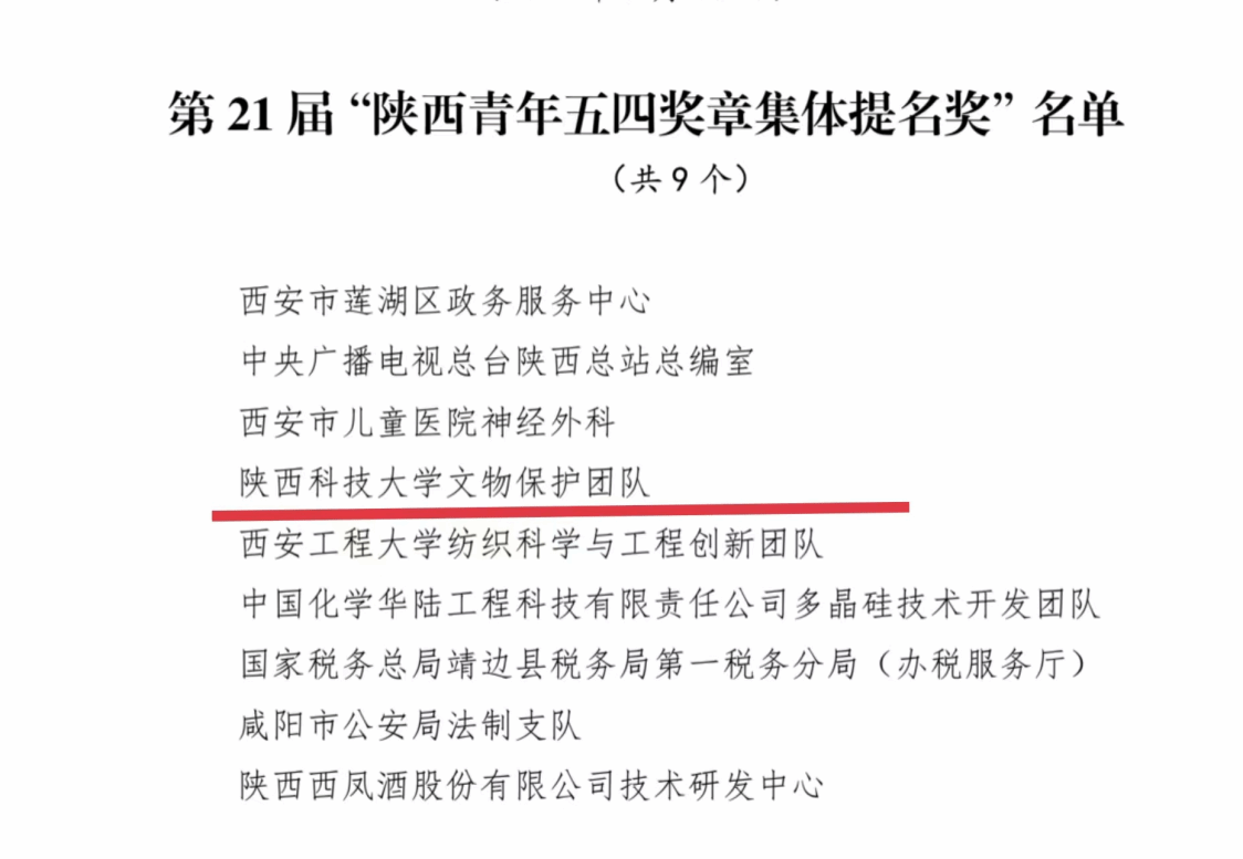 為集中展現(xiàn)新時代陜西青年的精神風(fēng)貌與價值追求,樹立堅定不移聽黨話、跟黨走,勇?lián)褡鍙?fù)興重任的優(yōu)秀青年典型,激勵全省青年奮發(fā)有為,奮力投身中國式現(xiàn)代化建設(shè),共青團陜西省委和陜西省青年聯(lián)合會開展了“陜西青年五四獎?wù)隆痹u選表彰活動,近日公布了評選結(jié)果,我校材料科學(xué)與工程學(xué)院(文物保護科學(xué)與技術(shù)學(xué)院)文物保護團隊榮獲第21屆“陜西青年五四獎?wù)录w提名獎”。