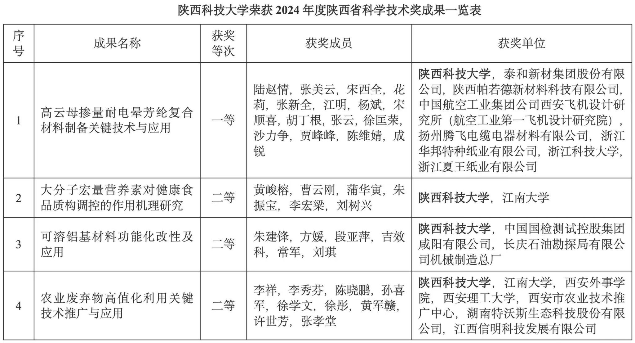 近日,中共陜西省委、陜西省人民政府發(fā)布《關(guān)于2024年度陜西省科學(xué)技術(shù)獎(jiǎng)勵(lì)的決定》(陜字〔2025〕72號(hào)),陜西科技大學(xué)共6項(xiàng)科研成果獲獎(jiǎng),其中作為主持單位獲一等獎(jiǎng)1項(xiàng)、二等獎(jiǎng)3項(xiàng),作為參與單位獲得一等獎(jiǎng)1項(xiàng)、三等獎(jiǎng)1項(xiàng)。