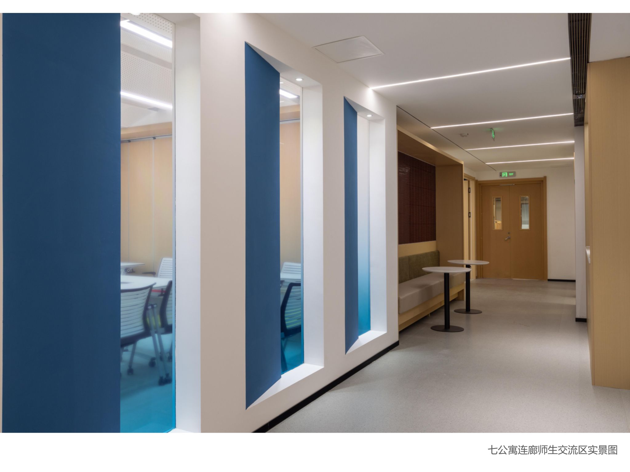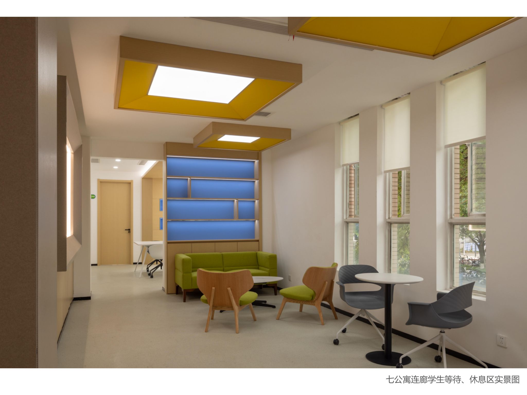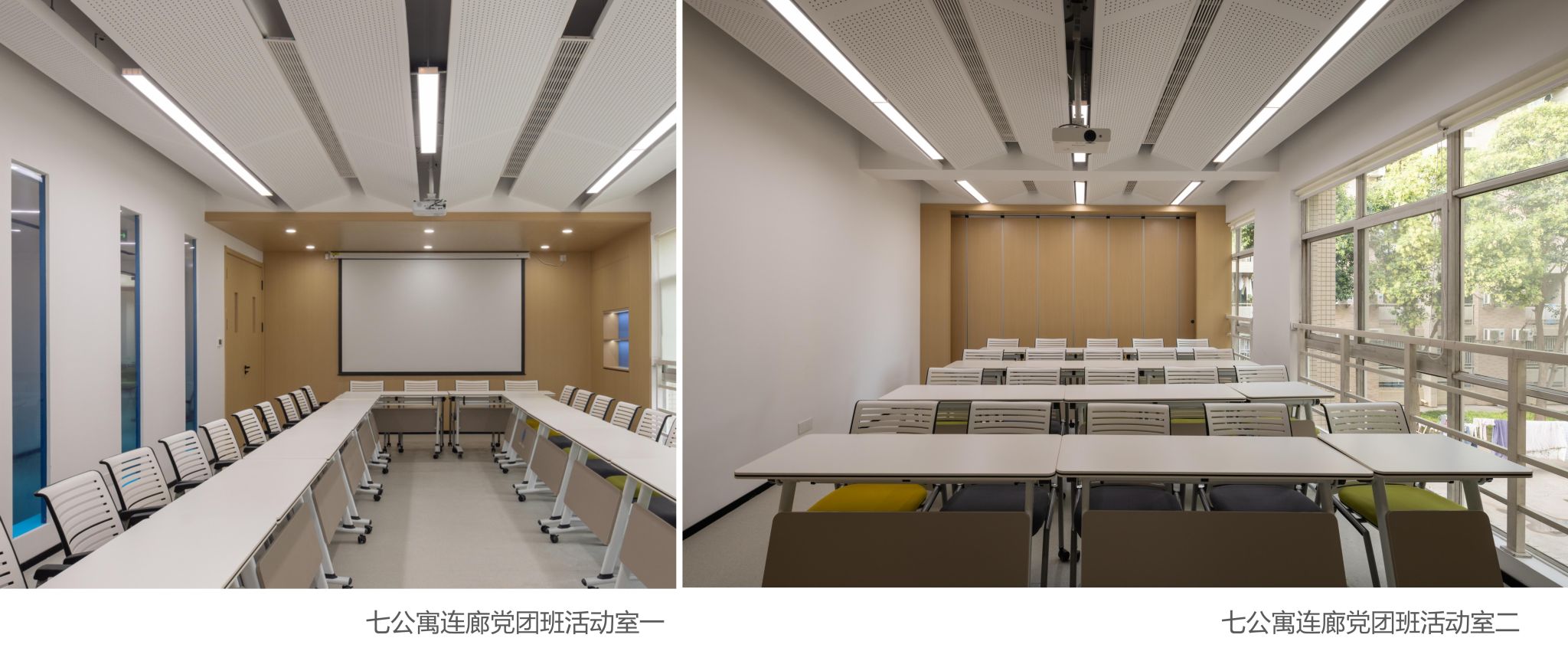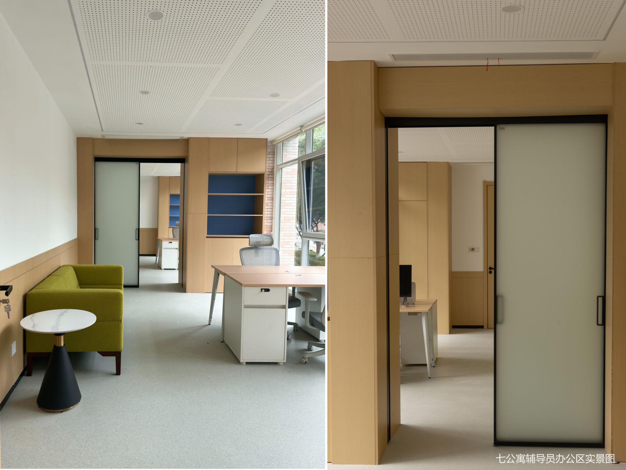 與此同時(shí),學(xué)校還將學(xué)生七公寓作為“1+N”布局的第一個(gè)試點(diǎn)建設(shè)社區(qū)服務(wù)站進(jìn)行了改造,建成了服務(wù)于輔導(dǎo)員入駐、各育人主體下沉和黨團(tuán)班集體活動(dòng)的多功能空間。公寓連廊一二層設(shè)有4間8個(gè)工位的輔導(dǎo)員辦公室,滿足該公寓學(xué)生帶班輔導(dǎo)員的入駐辦公需要;一樓大廳外設(shè)有開放式黨團(tuán)班共享會(huì)議室,大廳內(nèi)重新改造裝修,面貌煥然一新,閱讀書柜、舒適沙發(fā)一體配備,成為學(xué)生日常休憩、互動(dòng)交流的新空間;連廊二樓專門外加鋼構(gòu)樓梯,實(shí)現(xiàn)動(dòng)線獨(dú)立分流,為各班級(jí)集中開展活動(dòng)提供便利的專用通道,內(nèi)設(shè)有研討區(qū)、學(xué)生等待休息區(qū),建有黨團(tuán)班活動(dòng)室,多媒體互動(dòng)屏、移動(dòng)桌椅一應(yīng)俱全,折疊門可以根據(jù)使用人數(shù)靈活調(diào)整空間大小,既能承載兩個(gè)班體量的大規(guī)模集體活動(dòng),也能適應(yīng)小范圍的小組討論,實(shí)現(xiàn)了空間利用最大化,也為學(xué)校各育人力量進(jìn)公寓開展工作提供了場(chǎng)地及設(shè)備保障;談心談話室精心建設(shè),舒適的沙發(fā)、溫暖的墻面配色,為師生咨詢談話提供了私密、安靜、舒適的空間。社區(qū)服務(wù)站的試點(diǎn)建成為我校推動(dòng)各育人力量下沉社區(qū),輔導(dǎo)員及時(shí)響應(yīng)學(xué)生訴求、就近就便開展教育管理服務(wù)工作,推進(jìn)"服務(wù)到樓、關(guān)懷到人"理念落實(shí),實(shí)現(xiàn)"小事不出樓宇,大事不出社區(qū)"目標(biāo)提供了空間環(huán)境保障。
