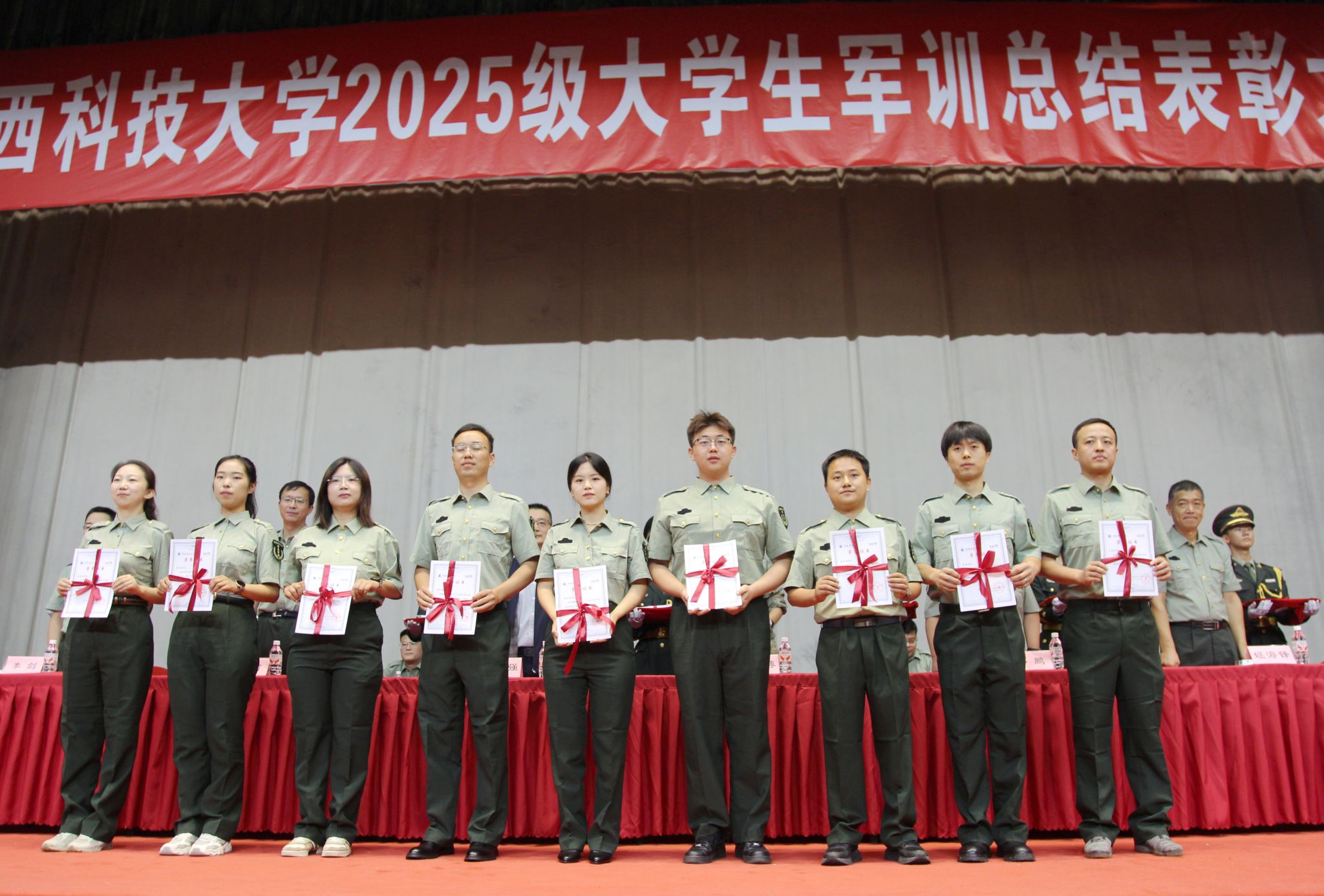 9月18日上午,我校2025級大學(xué)生軍事訓(xùn)練總結(jié)表彰大會在教學(xué)區(qū)文體館舉行。大學(xué)生軍訓(xùn)工作委員會副主任、副校長費貴強,軍訓(xùn)旅旅長、中國人民解放軍某部政治部副主任閆衛(wèi)博,軍訓(xùn)旅副旅長、中國人民解放軍某部參謀姜廣毅,軍訓(xùn)旅各部門負(fù)責(zé)人,各營教導(dǎo)員、指導(dǎo)員參加大會。大會由軍訓(xùn)旅政委、學(xué)工部(武裝部)部長李曉主持。