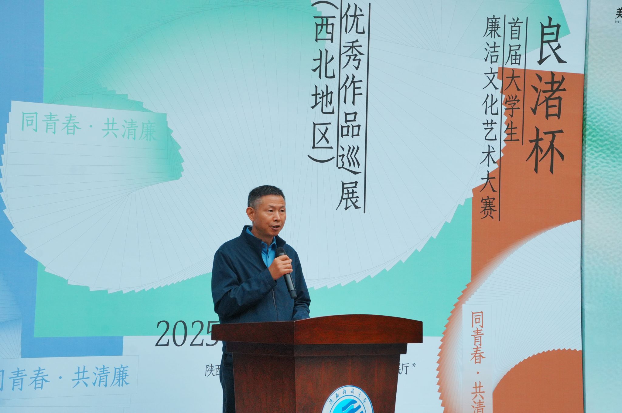 9月19日上午,“良渚杯”首屆大學(xué)生廉潔文化藝術(shù)大賽優(yōu)秀作品西北地區(qū)巡展、我校第六屆廉潔文化藝術(shù)大賽優(yōu)秀作品展開幕式在人文樓前廣場(chǎng)舉辦。省紀(jì)委監(jiān)委駐省教育廳紀(jì)檢監(jiān)察組副組長(zhǎng)呂少軍,中國(guó)美術(shù)學(xué)院黨委委員、紀(jì)委書記、監(jiān)察專員陳于杰,我校黨委副書記、紀(jì)委書記、監(jiān)察專員羅瑩出席開幕式。開幕式由設(shè)計(jì)與藝術(shù)學(xué)院院長(zhǎng)劉宗明主持。