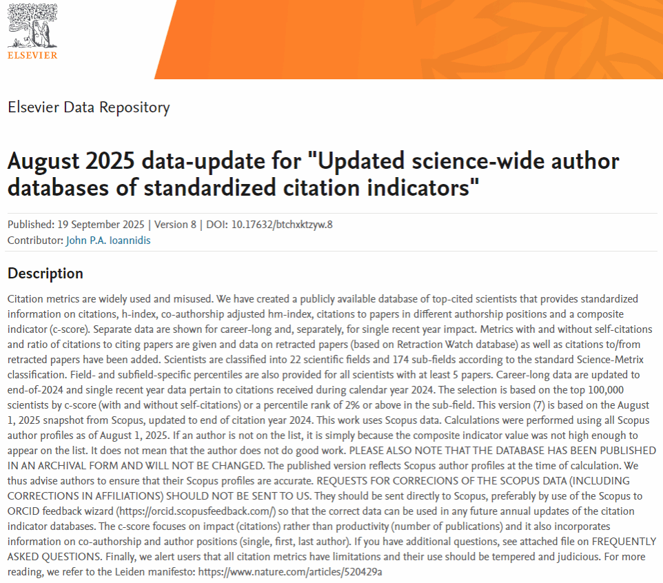 全球前2%頂尖科學(xué)家榜單基于Scopus數(shù)據(jù)庫詳盡的引用數(shù)據(jù)分析,通過綜合考慮論文被引次數(shù)、H指數(shù)、HM因子、單獨(dú)或第一作者的文章引用數(shù)等綜合指標(biāo),從全球近700萬名科學(xué)家中遴選出世界排名前2%的科學(xué)家,涵蓋22個(gè)領(lǐng)域和174個(gè)子領(lǐng)域。其中,“終身影響力”榜單統(tǒng)計(jì)科學(xué)家職業(yè)生涯期間的綜合表現(xiàn),“年度影響力”榜單則聚焦上一年度的學(xué)術(shù)影響力。