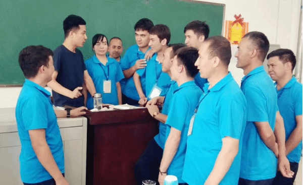 石海旺(左一)向少數(shù)民族同事請(qǐng)教學(xué)習(xí)維吾爾語
