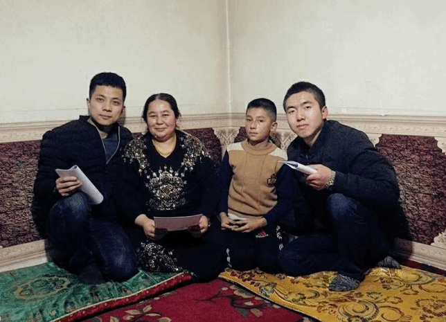 石海旺(左一)到村民家中宣傳黨的惠民政策