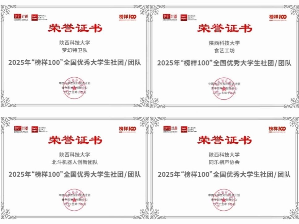 近日,2025“榜樣100”全國大學生優(yōu)秀社團案例榜單正式發(fā)布,陜西科技大學四支學生社團——夢幻特衛(wèi)隊、食藝工坊、北斗機器人創(chuàng)新團隊與同樂相聲協(xié)會,從全國376所高校的1320支參評團隊中脫穎而出,成功入選全國優(yōu)秀大學生社團案例,展現(xiàn)了我校社團建設的成果與活力。