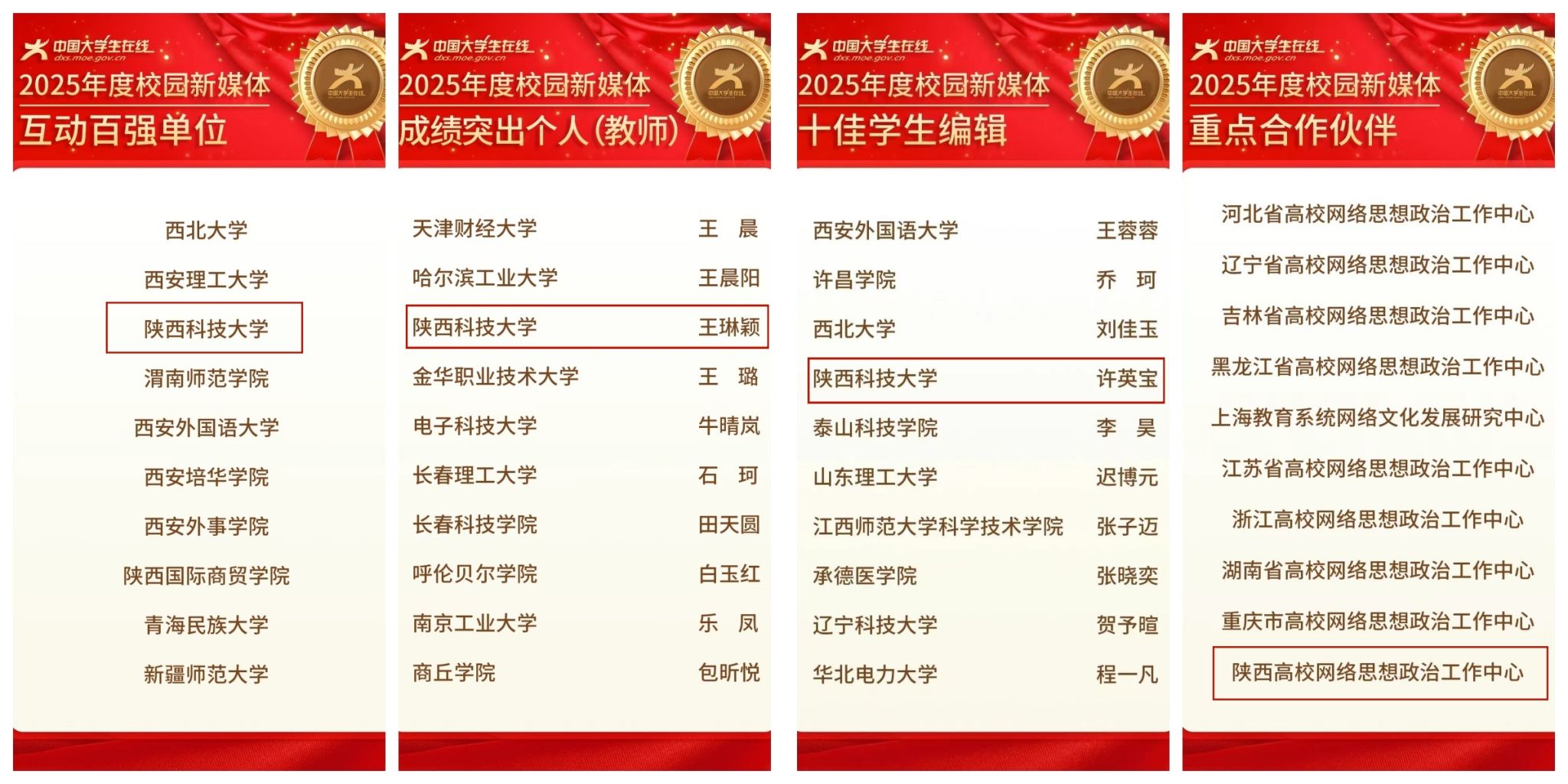 近日,教育部“中國大學生在線”2025年度校園新媒體表彰名單公布,陜西科技大學榮獲多個獎項。其中,我校獲評“互動百強單位”,輕工科學與工程學院王琳穎榮獲“成績突出個人(教師)”,設計與藝術學院播音與主持專業(yè)241班許英寶榮獲“十佳學生編輯”,陜西高校網(wǎng)絡思想政治工作中心榮獲“重點合作伙伴”。