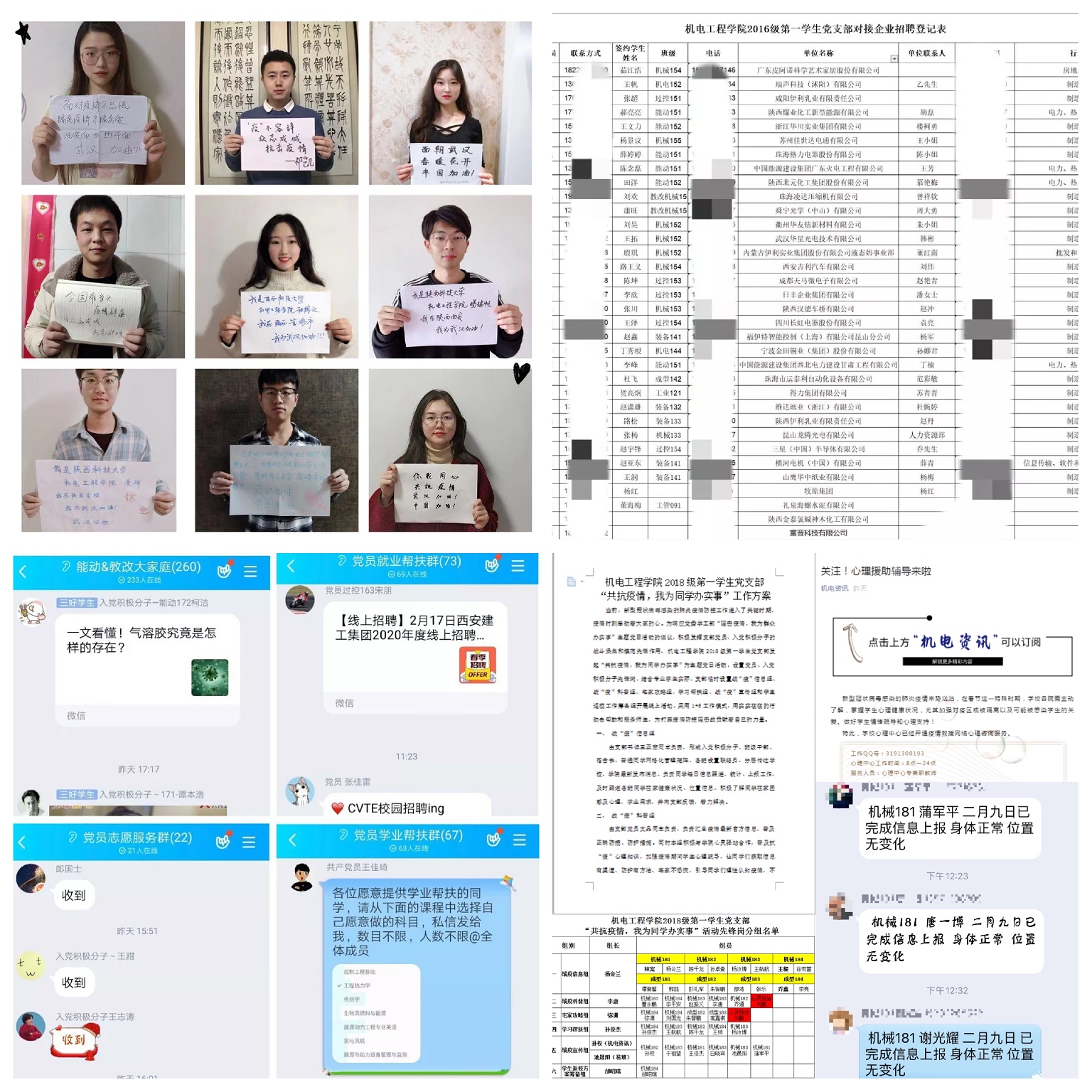 2016級(jí)三個(gè)學(xué)生黨支部根據(jù)畢業(yè)班學(xué)生就業(yè)、考研的實(shí)際情況,開展分類指導(dǎo),精準(zhǔn)幫扶。2016級(jí)第一、二學(xué)生黨支部積極開展就業(yè)、考研、學(xué)業(yè)幫扶工作,持續(xù)開展“一聯(lián)一幫”活動(dòng),即聯(lián)系企業(yè)和幫助就業(yè)困難學(xué)生。2016級(jí)第三學(xué)生黨支部動(dòng)員全體黨員和積極分子,成立疫情信息統(tǒng)計(jì)與防治、就業(yè)考研服務(wù)、資源分享三類專題小組,指導(dǎo)學(xué)生科學(xué)防治疫情,對(duì)考研及就業(yè)學(xué)生精準(zhǔn)施策。