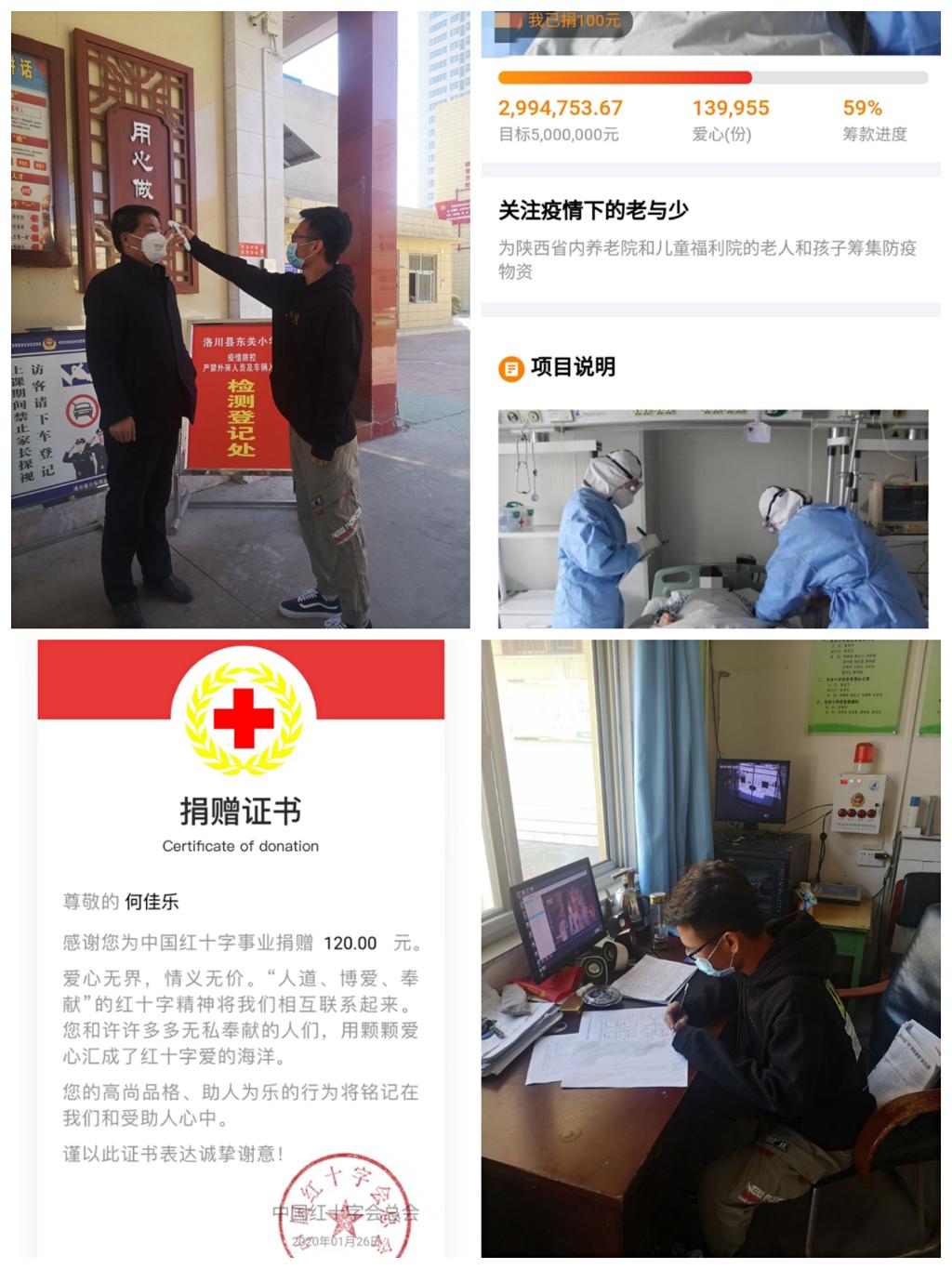 學生第三黨支部黨員杜丹陽同志在疫情防控工作中主動擔當,身先士卒。作為一名學生黨員,杜丹陽同志在家鄉(xiāng)疫情防控工作中主動請纓,參與寶雞市鳳翔縣虢王鎮(zhèn)劉淡村村委會組織的黨員服務(wù)活動,在劉淡村南路口卡點處協(xié)助登記進出入車輛及人員,協(xié)助村干部開展防疫宣傳;作為一名學生干部,他積極踐行志愿服務(wù),積極幫助班級同學,建立并參與四六級打卡群,進行考研知識分享,同時通過“支付寶”平臺給陜西省內(nèi)養(yǎng)老院和兒童福利院的老人和孩子籌集防疫物資并進行捐款,用自身行動詮釋了共產(chǎn)黨員的責任與擔當。