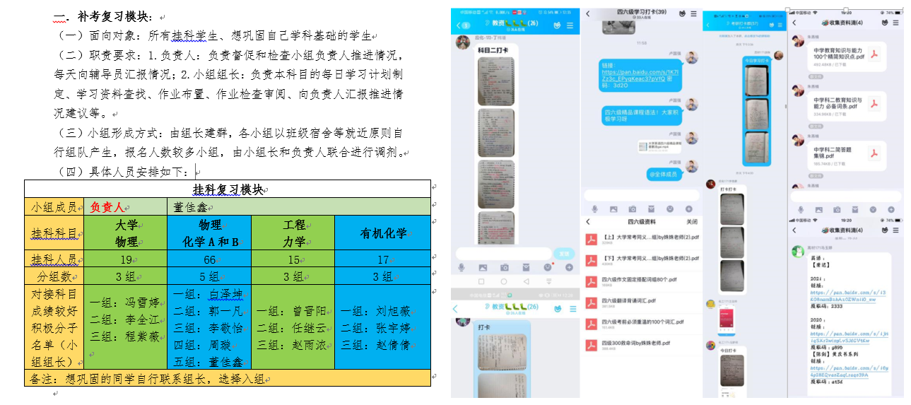 2017級本科生黨支部結(jié)合年級特點,依托前期定崗設(shè)責,下沉班級開展“自主學習,我在行”主題黨日活動,在疫情期間開展特殊學業(yè)幫扶活動。分別設(shè)立考研、四六級、教資三個幫幫圈,堅持 “每日學習打卡制度”,專人監(jiān)督記錄學習打卡情況,設(shè)立獎懲機制;持續(xù)更新學習資料,以三日為一個周期進行發(fā)布;黨員與學業(yè)困難學生一對一線上幫扶,每周群內(nèi)公示幫扶進度,截止今日,幫幫圈覆蓋面達年級75%,切實做到停課不停學,學習戰(zhàn)“疫”不掉隊,開學領(lǐng)跑第一步;2018級本科生黨支部通過前期深入調(diào)研,了解到學生的亟待訴求分為四方面:1.補考復習;2.課前預習;3.四六級學習;4.考證學習。針對四方面訴求,分派任務(wù)到人,設(shè)立明確學習目標、學習進度表和項目負責人,確保職責到人、幫扶到位、服務(wù)落實;2016級本科黨員陳鑫國義無反顧加入寶雞市鳳翔縣指揮鎮(zhèn)連村的疫情防控志愿者工作,協(xié)助村干部做好排查登記,宣傳新型冠狀病毒肺炎的相關(guān)知識,默默貢獻力量。