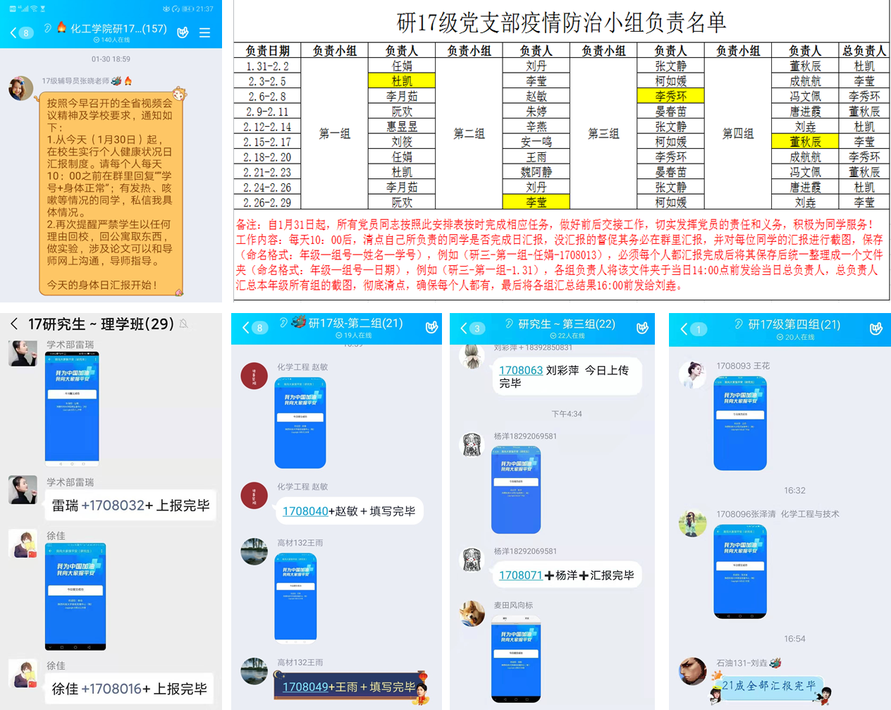 2月7日以來,機電學院輔導員王正宏組織支部黨員構(gòu)建1+6戰(zhàn)“疫”模式,通過網(wǎng)絡發(fā)起1場“共抗疫情,我為同學辦實事”主題黨日活動,支部對口的30名入黨積極分子加入,迅速組建成6個工作組,全員行動助力疫情防控,服務同學。信息組構(gòu)建年級網(wǎng)格化管理矩陣,每日協(xié)助輔導員了解學生信息、居家困惑及心理、學業(yè)需求;科普組累計發(fā)布疫情信息、防護知識43條;宅家攻略組發(fā)布居家健身、心理防護知識3期;學業(yè)幫扶組根據(jù)47名同學學業(yè)幫扶需求,每日開展線上答疑、打卡活動;學生返校工作籌備組提前建立專業(yè)學生返校工作方案,為學院學生返校健康篩查、入住宿舍、學習生活做好準備。