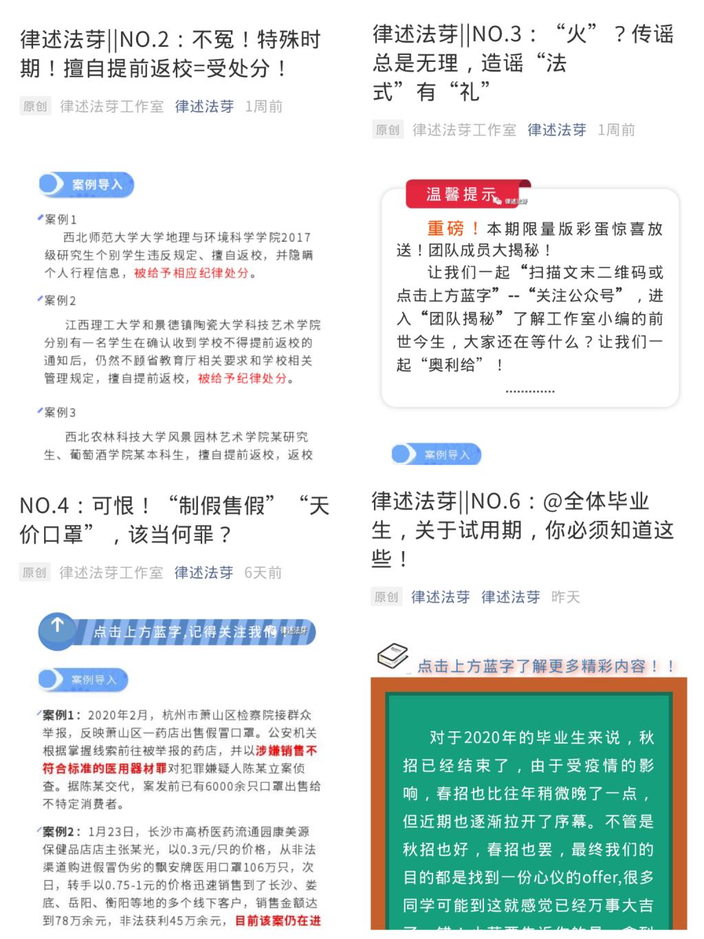 為進一步增強廣大師生“學法、知法、懂法、守法”的法治觀念,電智學院輔導員劉貝民牽頭成立了“律述法芽工作室”,及時將國家政策、輿論熱點和自身專業(yè)相結(jié)合,從法律的角度進行解讀、宣傳。原創(chuàng)《拘!疫情當下,拒不配合防控措施可能涉及犯罪》、《不冤!特殊時期!擅自提前返校=受處分!》和《“火”?傳謠總是無理,造謠“法式”有“禮”》等10余篇文章,引導學生遵守紀律,不擅自返校,勿聽勿信謠言。