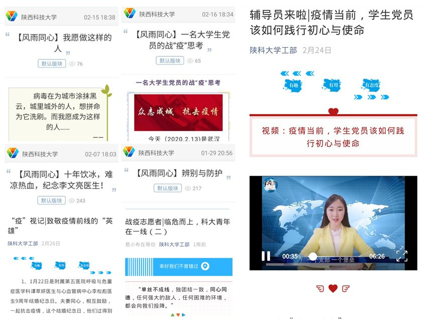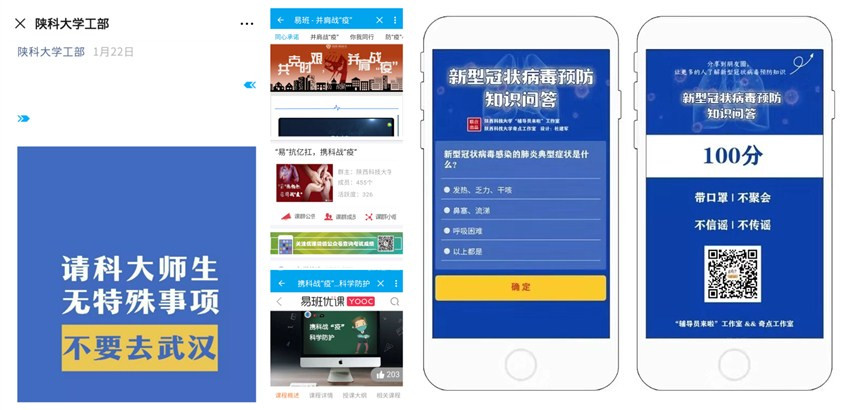 1月22日,學(xué)工部通過(guò)易班、陜科大學(xué)工部官方微信公眾號(hào)推送《關(guān)于新型肺炎,科大師生支持請(qǐng)轉(zhuǎn)》,第一時(shí)間號(hào)召全體師生加強(qiáng)防范,該條推文獲得7000+瀏覽。隨后,上線“共克時(shí)艱,并肩戰(zhàn)疫”輕應(yīng)用、“易抗億扛,攜科戰(zhàn)疫”、“攜科戰(zhàn)疫,科學(xué)防護(hù)”等優(yōu)課課群,每日更新疫情相關(guān)動(dòng)態(tài)、防護(hù)知識(shí)和學(xué)校疫情防控各項(xiàng)工作通知,引導(dǎo)學(xué)生積極應(yīng)對(duì)疫情,堅(jiān)定必勝信念;開(kāi)展“新型冠狀病毒肺炎防控知識(shí)問(wèn)答”活動(dòng),累計(jì)超過(guò)35萬(wàn)人參與知識(shí)問(wèn)答,產(chǎn)生了良好的社會(huì)效應(yīng)。