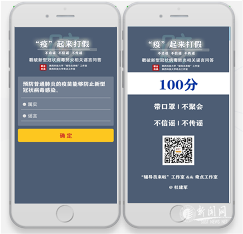 學(xué)工部基于易班平臺(tái)開(kāi)展“疫起來(lái)打假”——戳破疫情相關(guān)謠言問(wèn)答活動(dòng),截至目前已有8000余名師生參與答題;“輔導(dǎo)員來(lái)啦”、“律述法芽”輔導(dǎo)員網(wǎng)絡(luò)文化工作室以視頻、圖文等形式制作《我與老媽智斗謠言的日子視頻》《“火”?傳謠總是無(wú)理,造謠“法式”有“禮”》等作品,并通過(guò)優(yōu)課課群話題討論等多種形式廣泛開(kāi)展辟謠活動(dòng),在疫情期間始終堅(jiān)持為師生維護(hù)清朗的網(wǎng)絡(luò)空間,引導(dǎo)廣大學(xué)生學(xué)會(huì)辨識(shí)形形色色的網(wǎng)絡(luò)信息。
