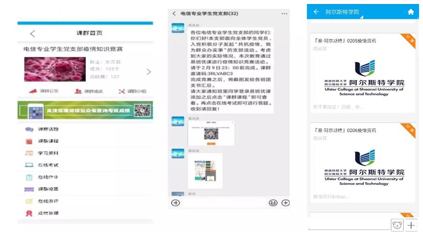 在學(xué)工部的帶動(dòng)下,各學(xué)院易班工作站也積極響應(yīng)。電子信息與人工智能學(xué)院易班工作站與學(xué)院黨務(wù)中溝通協(xié)調(diào),基于易班平臺(tái)搭建疫情知識(shí)競(jìng)賽,以賽促學(xué);阿爾斯特學(xué)院易班工作站堅(jiān)持每日整理發(fā)布“每日疫情資訊”,上線“新冠病毒我知道”優(yōu)課課群開(kāi)展知識(shí)問(wèn)答,通過(guò)內(nèi)容豐富、設(shè)計(jì)合理的在線測(cè)試普及防疫知識(shí),強(qiáng)化科學(xué)防疫意識(shí),堅(jiān)定戰(zhàn)疫信心。