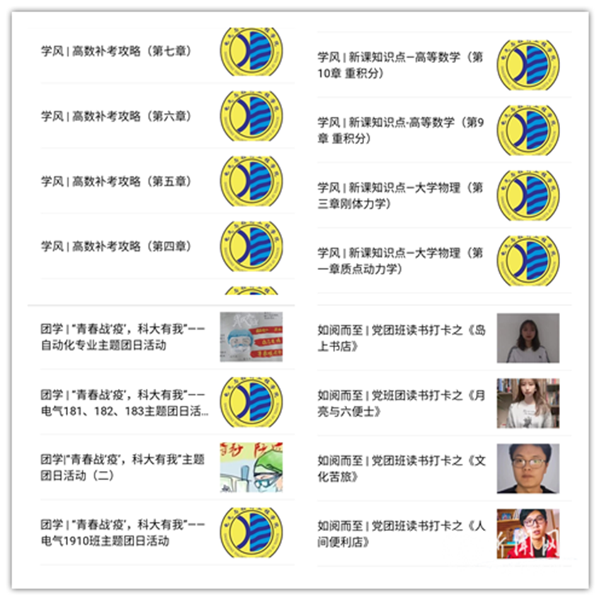 電氣與控制工程學(xué)院易班工作站利用易班社區(qū)互動(dòng)平臺(tái)開(kāi)展“如閱而至”黨團(tuán)班讀書(shū)打卡活動(dòng)、“補(bǔ)考攻略”復(fù)習(xí)打卡活動(dòng)、“新課知識(shí)點(diǎn)”學(xué)習(xí)打卡活動(dòng)、“青春戰(zhàn)‘疫’,科大有我”主題團(tuán)日活動(dòng)風(fēng)采展等,引導(dǎo)學(xué)生充分利用假期進(jìn)行學(xué)習(xí),補(bǔ)充精神之“鈣”。