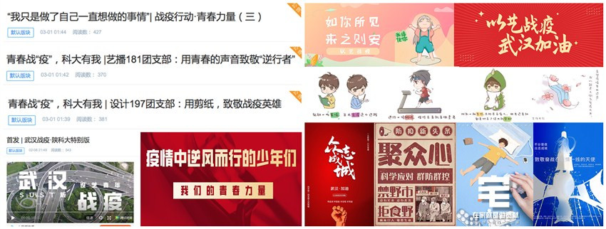 設(shè)計(jì)與藝術(shù)學(xué)院易班工作站結(jié)合學(xué)院特色,開(kāi)通“以藝戰(zhàn)疫”專(zhuān)欄,把從各學(xué)生黨支部、團(tuán)支部征集的40余幅作品進(jìn)行展播,凝聚愛(ài)國(guó)共識(shí)。手繪條漫《特殊時(shí)期給我?guī)?lái)的……》、剪紙《致敬戰(zhàn)疫英雄》等作品,用設(shè)計(jì)定格感動(dòng);藝播專(zhuān)業(yè)創(chuàng)作的《用青春的聲音致敬逆行英雄》,用音頻傳遞信念;學(xué)生會(huì)創(chuàng)作的MV《平凡天使》,用歌聲鼓舞人心;編導(dǎo)專(zhuān)業(yè)創(chuàng)作的《武漢戰(zhàn)疫》SUST特別版、《我們是湖北Susters,向母校報(bào)到??拼笠?jiàn)!》,用影像凝聚溫暖;學(xué)生事跡系列報(bào)道《戰(zhàn)疫行動(dòng),青春力量》和文章《一名設(shè)藝青年眼中的“逆行者”父親》,用文字記錄擔(dān)當(dāng)。