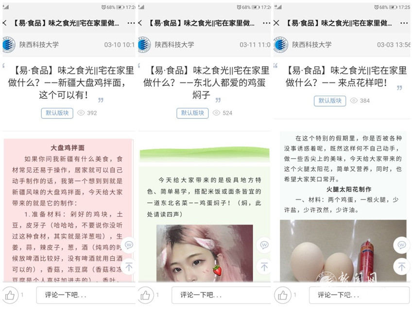 食品與生物工程學(xué)院易班工作站依托易班社區(qū)互動(dòng)平臺(tái)開(kāi)設(shè)“味之食光”專(zhuān)欄,號(hào)召?gòu)V大學(xué)子們親自動(dòng)手學(xué)做美食,用視頻、圖文等形式進(jìn)行呈現(xiàn),將提升個(gè)人生活技能與人文素養(yǎng)相結(jié)合、提升鉆研能力與專(zhuān)業(yè)認(rèn)知相結(jié)合,在勞動(dòng)中感受生活、感悟成長(zhǎng)。截至目前,已經(jīng)發(fā)布推文20篇,累計(jì)閱讀量6800余次,深受同學(xué)們喜愛(ài)。食品教改18的朱姬穎在學(xué)習(xí)并嘗試制作“姥姥真?zhèn)髋朴蜅l”后表示,“習(xí)近平總書(shū)記在全國(guó)教育大會(huì)上強(qiáng)調(diào),‘要在學(xué)生中弘揚(yáng)勞動(dòng)精神,教育引導(dǎo)學(xué)生崇尚勞動(dòng)、尊重勞動(dòng),懂得勞動(dòng)最光榮、勞動(dòng)最崇高、勞動(dòng)最偉大、勞動(dòng)最美麗的道理?!瘎趧?dòng)不僅讓我收獲了與家人在一起的快樂(lè),更讓我深刻的認(rèn)識(shí)到勞動(dòng)是我們生活不可或缺的一部分,以后我們也要積極參加勞動(dòng),成為新時(shí)代合格建設(shè)者和可靠接班人。”