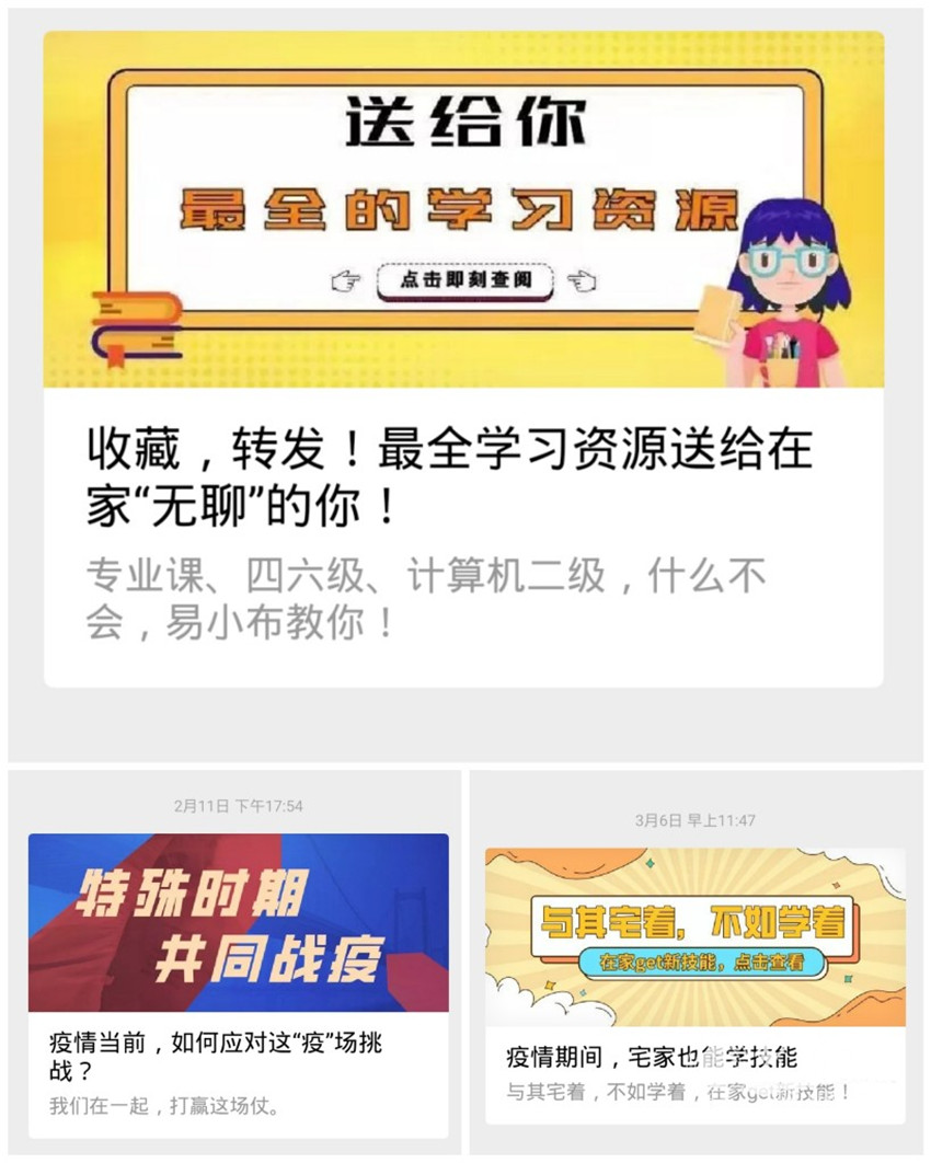 為消除假期延長(zhǎng)可能給學(xué)生帶來(lái)的懈怠、懶散等負(fù)面影響,學(xué)工部充分利用易班平臺(tái)社區(qū)互動(dòng)優(yōu)勢(shì),持續(xù)更新優(yōu)課課群,豐富線上學(xué)習(xí)資源,及時(shí)補(bǔ)給學(xué)習(xí)提升的養(yǎng)分。易班發(fā)展中心充分利用新媒體矩陣,通過(guò)易班、QQ、微信、抖音平臺(tái)發(fā)布《收藏,轉(zhuǎn)發(fā)!最全學(xué)習(xí)資源送給在家“無(wú)聊”的你》《疫情之下,如何面對(duì)這一場(chǎng)挑戰(zhàn)》、《上網(wǎng)課的你和老師》等圖文、視頻作品,深化思想引領(lǐng),引導(dǎo)學(xué)生加強(qiáng)自我管理,科學(xué)合理規(guī)劃假期生活,停課不停學(xué)。