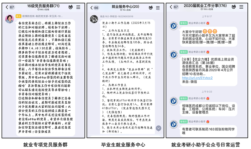 黨員主動(dòng)擔(dān)當(dāng),學(xué)生朋輩骨干助力。全體畢業(yè)生黨員主動(dòng)擔(dān)當(dāng),作為工作骨干參與并組建了學(xué)院畢業(yè)生就業(yè)服務(wù)中心—年級(jí)就業(yè)干事—就業(yè)專項(xiàng)黨員—班團(tuán)兩委的四級(jí)就業(yè)團(tuán)隊(duì),積極在就業(yè)服務(wù)工作中發(fā)揮先鋒模范作用和朋輩效應(yīng)。團(tuán)隊(duì)為每專業(yè)配備1名就業(yè)干事協(xié)助就業(yè)工作,為每班級(jí)配備2名黨員輪流值周推送就業(yè)信息,為每名未就業(yè)學(xué)生指定畢業(yè)生黨員一對(duì)一結(jié)對(duì)精準(zhǔn)就業(yè)幫扶,同時(shí),學(xué)院就業(yè)服務(wù)中心運(yùn)營公眾號(hào)“就業(yè)考研小助手”,常態(tài)發(fā)布就業(yè)信息、協(xié)助就業(yè)簽約,實(shí)時(shí)更新,每周匯報(bào),年級(jí)內(nèi)形成了人人知就業(yè),人人推就業(yè)的良好局面。
