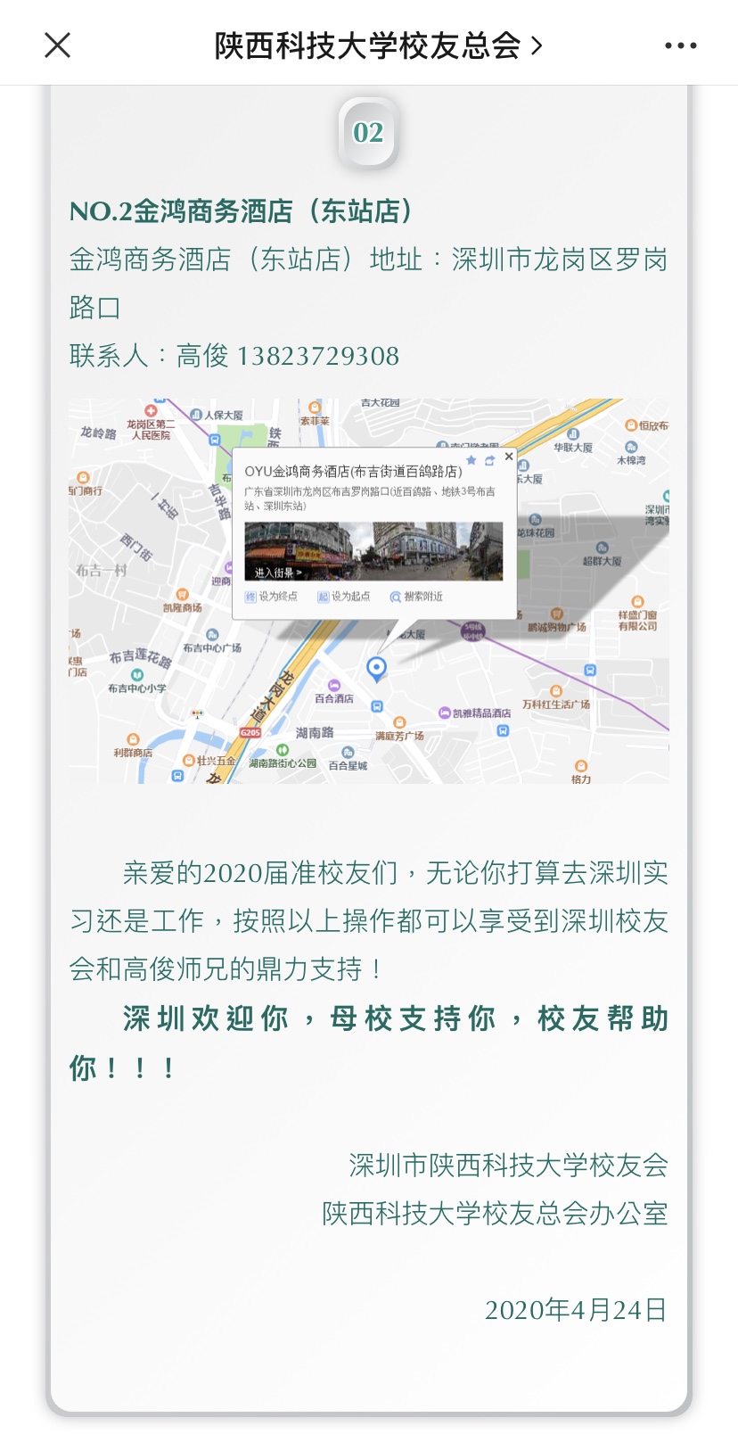 為幫助2020屆畢業(yè)生扎根深圳、順利度過(guò)從學(xué)生到社會(huì)人士的過(guò)渡期,日前,我校會(huì)計(jì)97級(jí)校友高俊(深圳校友會(huì)青委會(huì)會(huì)長(zhǎng))通過(guò)校友總會(huì)辦公室、深圳校友會(huì)向母校2020屆畢業(yè)生發(fā)出公告,即日起將為赴深工作的師弟師妹們提供5天免費(fèi)住宿。公告剛一發(fā)出,就得到了母校師生和社會(huì)的廣泛贊譽(yù)。